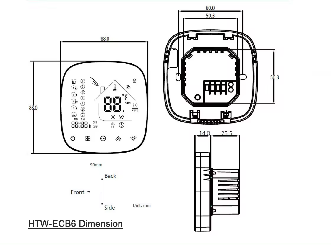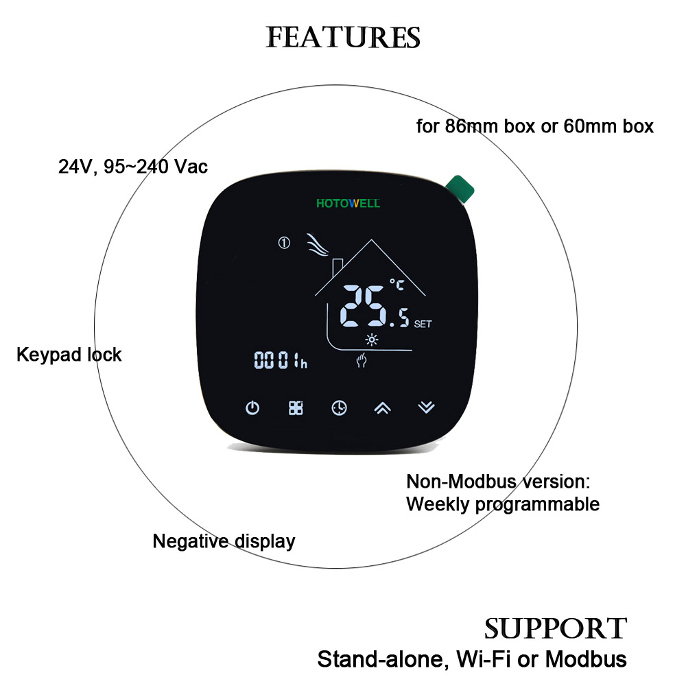 HTW-ECB6 series Wifi thermostat is widely used in these environment like Homes, Residential buildings, Schools, Hotels, Hospitals, Offices and etc. to main an ideal room temperature purpose. It can be used in Electric Underfloor Heating, Water Heating or Water/Gas Boiler systems.