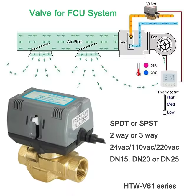 HTW-V61 series motorized valves(3-wire) are used to control the flow of hot water, chill water in heating, cooling or air-conditioning applications, so as to control room temperature indirectly. It consists of Actuator and Valve Body. The room temperature could be controlled in the set-point through turn-on or turn-off of valve.