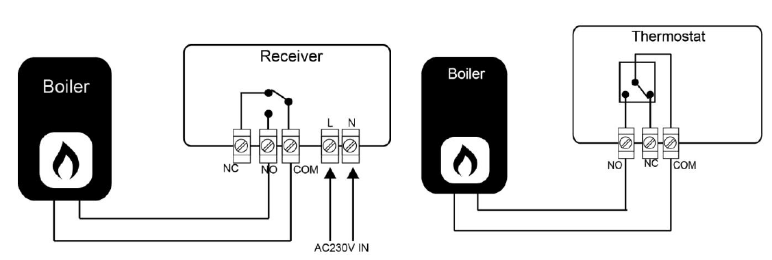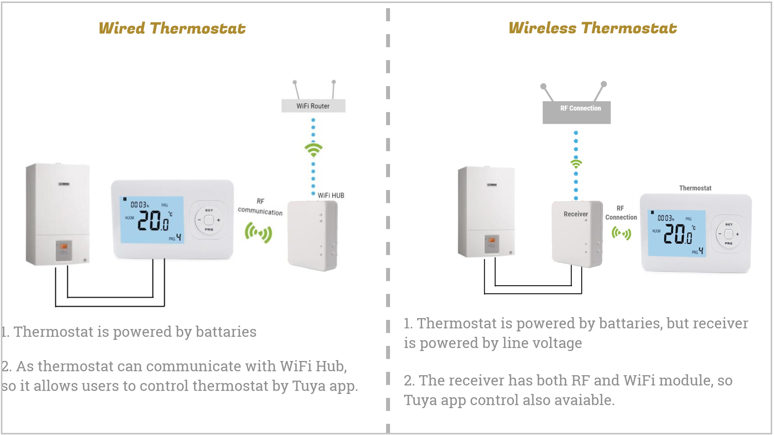 This new thermostat has a brightest spotlight, that is, the flexible installation. Both receiver and thermostat have non voltage output relay to on/off heating device such as boiler. This is means that you can buy one thermostat model to fit 2 kinds of installation style, it is awesome!