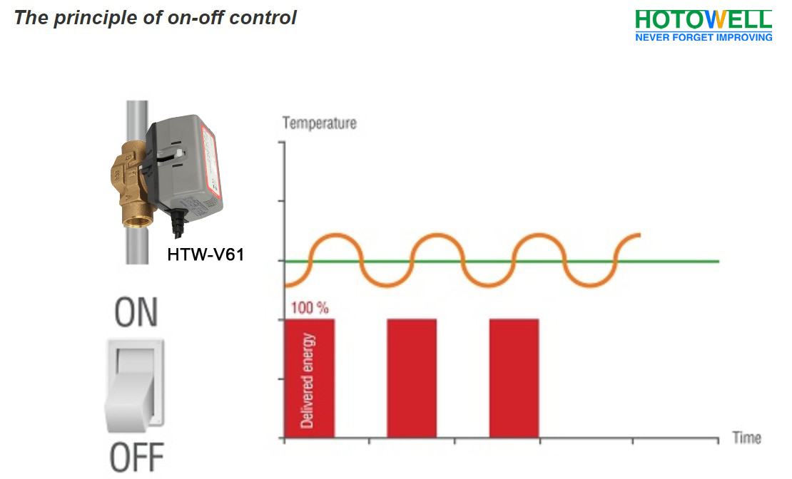 On-Off control is the simplest form of feedback control. In on-off control mode, the control valve with an on-off actuator delivers fully opened or fully closed. On-off control is widely used in domestic system’s temperature control.