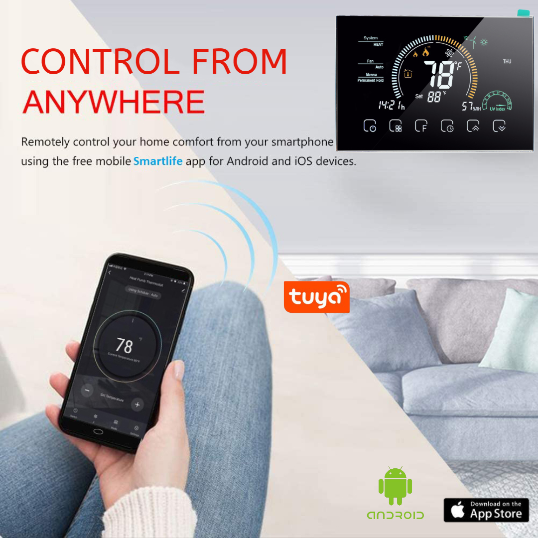 El termostato juega un papel esencial en estos dos tipos de control del sistema. El termostato de 2 etapas de la bomba de calor tiene 2 salidas de compresor para controlar 2 fuentes de calentadores o enfriadores; El termostato de horno de dos etapas se refiere al control de aire acondicionado convencional de 2 etapas, que también tiene 2 terminales para controlar 2 calentadores / enfriadores. En términos generales, los termostatos del mercado norteamericano tienen terminales que pueden ser compatibles con el sistema de unidad de aire acondicionado convencional y el sistema de bomba de calor en una sola unidad. Por ejemplo, termostato WiFi de múltiples etapas Hotowell HTW-MT08 y HTW-MT06, que se muestra a continuación como cableado de termostato de bomba de calor de 2 etapas y cableado de termostato de calefacción de 2 etapas como referencia.