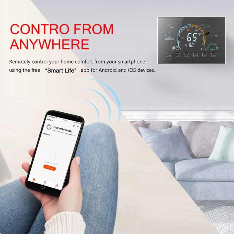 Los termostatos tradicionales le permiten subir o bajar la temperatura manualmente, pero los termostatos programables actuales brindan muchas funciones convenientes que pueden sorprenderlo. Además, el termostato programable Wifi le permite usar una aplicación en su teléfono inteligente o tableta para operar el termostato durante el viaje. La conexión Wi-Fi puede ayudarlo a ajustar la temperatura mientras trabaja o está de vacaciones en cualquier momento y en cualquier lugar.
