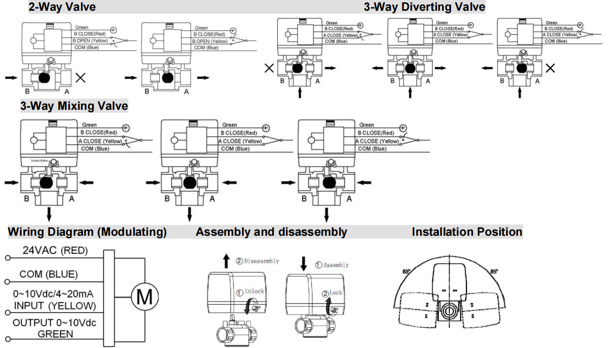 HTW-MV13 series Motorized Modulating Control Valve are mainly used in central air- conditioning cool/heat water system. It can accurately control the flow of cool/heat medium according to the actual requirement, and will not result in sudden change of temperature and to control the room temperature accurately. It provides two types: 2-way and 3-way with sizes: 1/2”, 3/4”, 1” and 1.1/4’’ optional.