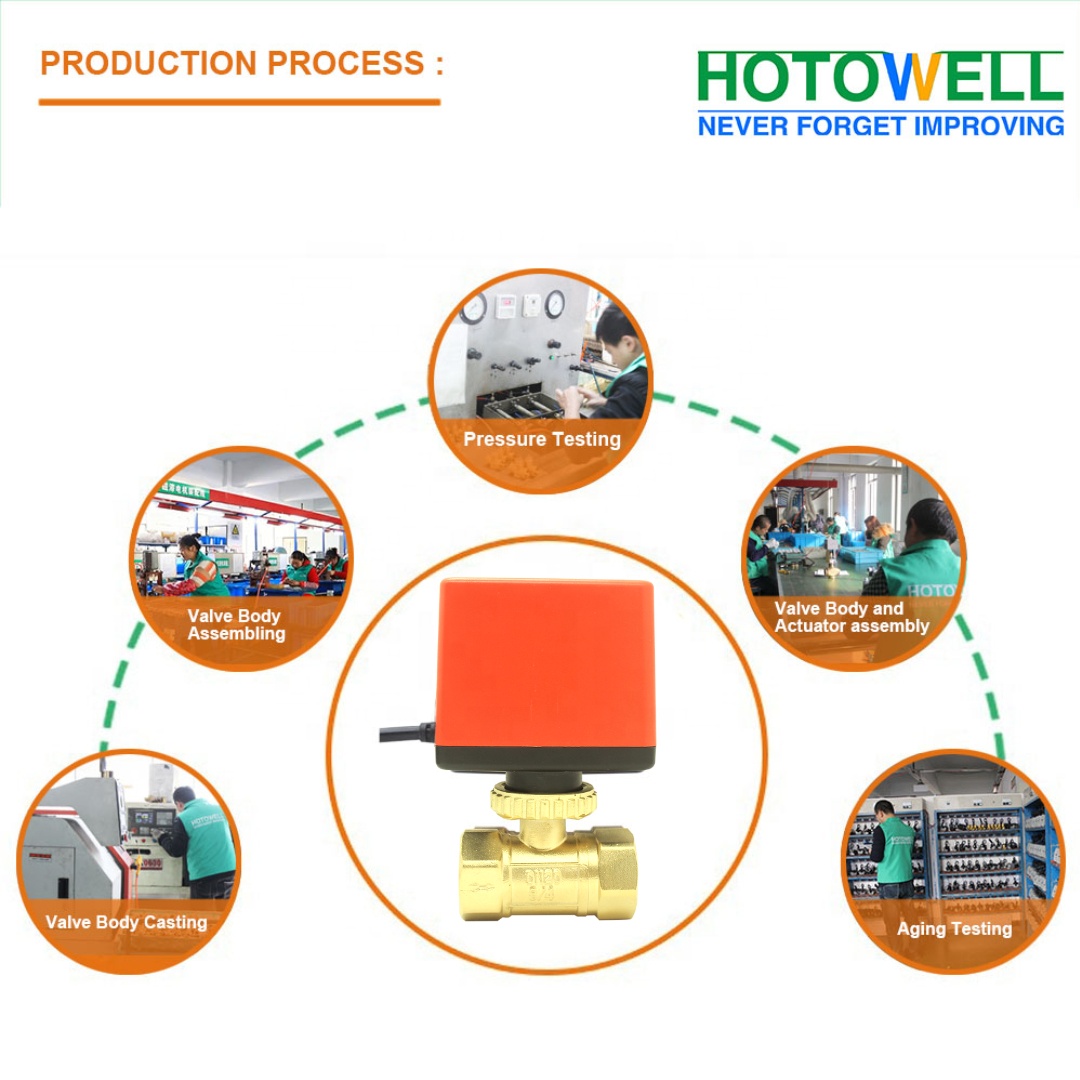 HTW-DH Series Motorized Ball Valves are used to control the on/off of heat/cool water air-conditioning system pipe to control the room temperature. The valve is driven by synchronous motor. The motor connects with room thermostats by the terminal of common, open and close. By sampling and dealing with the site data, the thermostats send control signal to open/close the motor of ball valve. Then the heat/cool water enters into fan coil unit to supply the heat or cool air. When the room temperature reaches the set-point, thermostat will send a signal to cut off the ball valve and make it on the best status. Then the room temperature will keep in the comfortable range. Valve thread size: G1/2、G3/4、G1、G1.1/4