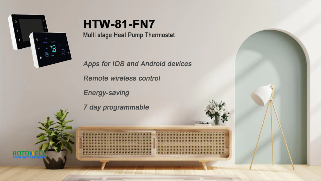 HTW-81-FN7 Multi-Stage thermostat is a device for indoor temperature control. It is mainly applied to heat pump system for heating/cooling, with 3 modes easily switchable: Schedule, Hold and Holiday. The device is of high reliability and practicability,and it can support up to 3H/2C system.