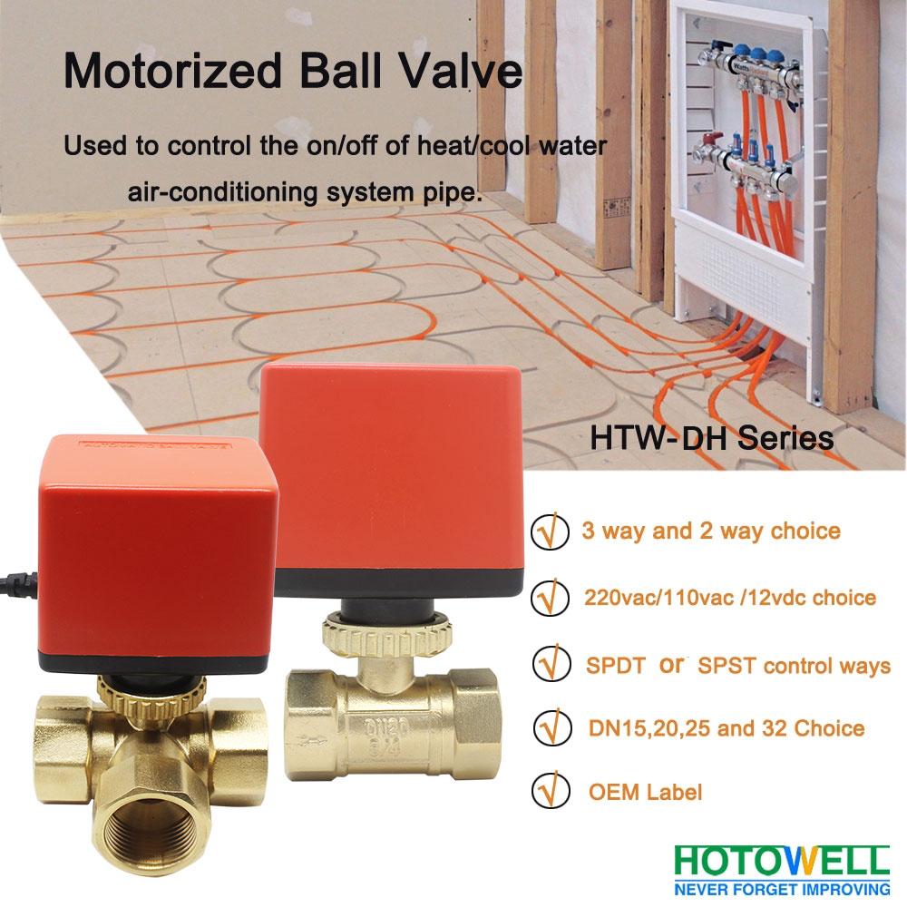 HTW-EG200 Series Motorized Ball Valves are used to control the on/off of heat/cool water air-conditioning system pipe to control the room temperature. The valve is driven by synchronous motor. The motor connects with room thermostats by the terminal of common, open and close. By sampling and dealing with the site data, the thermostats send control signal to open/close the motor of ball valve. Then the heat/cool water enters into fan coil unit to supply the heat or cool air. When the room temperature reaches the set-point, thermostat will send a signal to cut off the ball valve and make it on the best status. Then the room temperature will keep in the comfortable range.