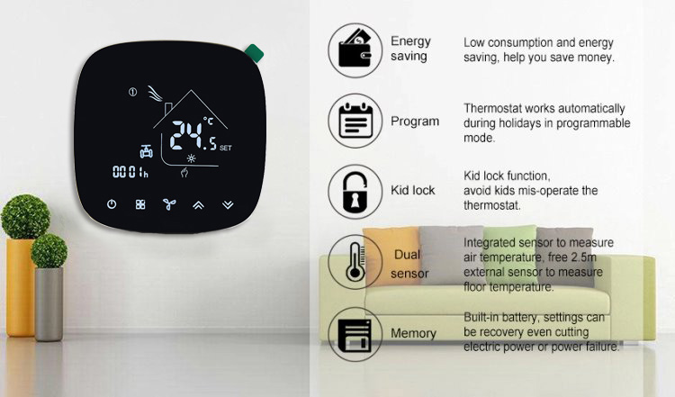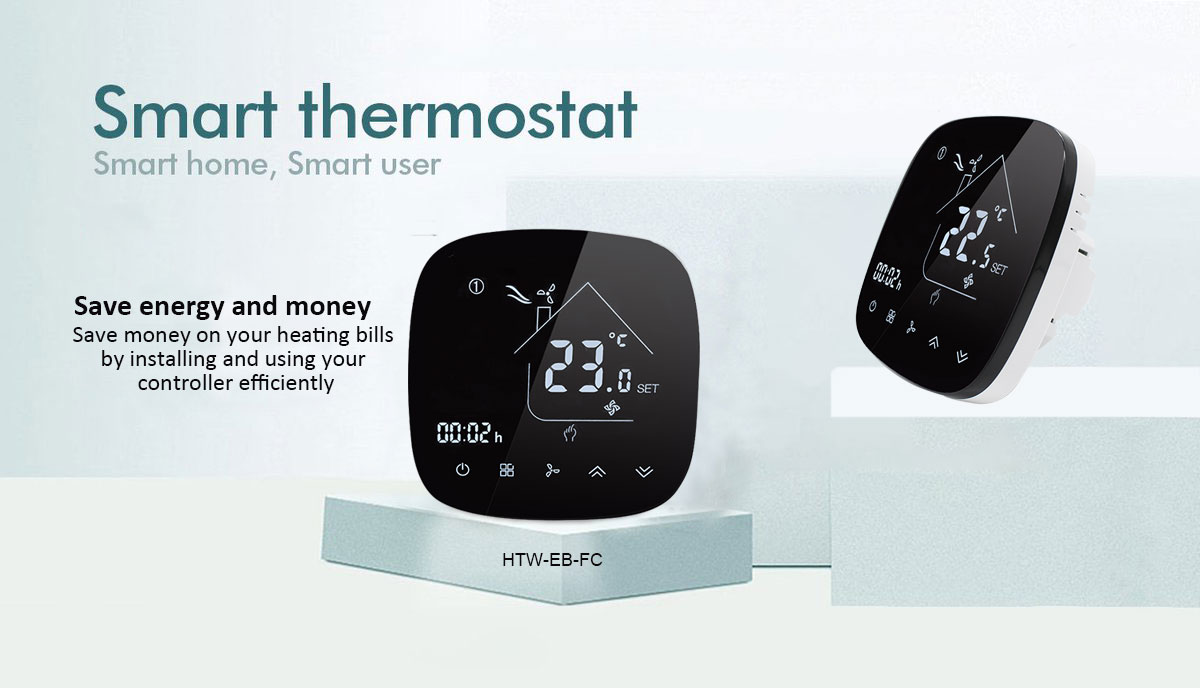 HTW-EB-FC series smart Wi-Fi fan coil thermostat is widely used in these environments like Homes, Residential buildings, Schools, Hotels, Hospitals, Offices and etc. to main an ideal room temperature purpose.