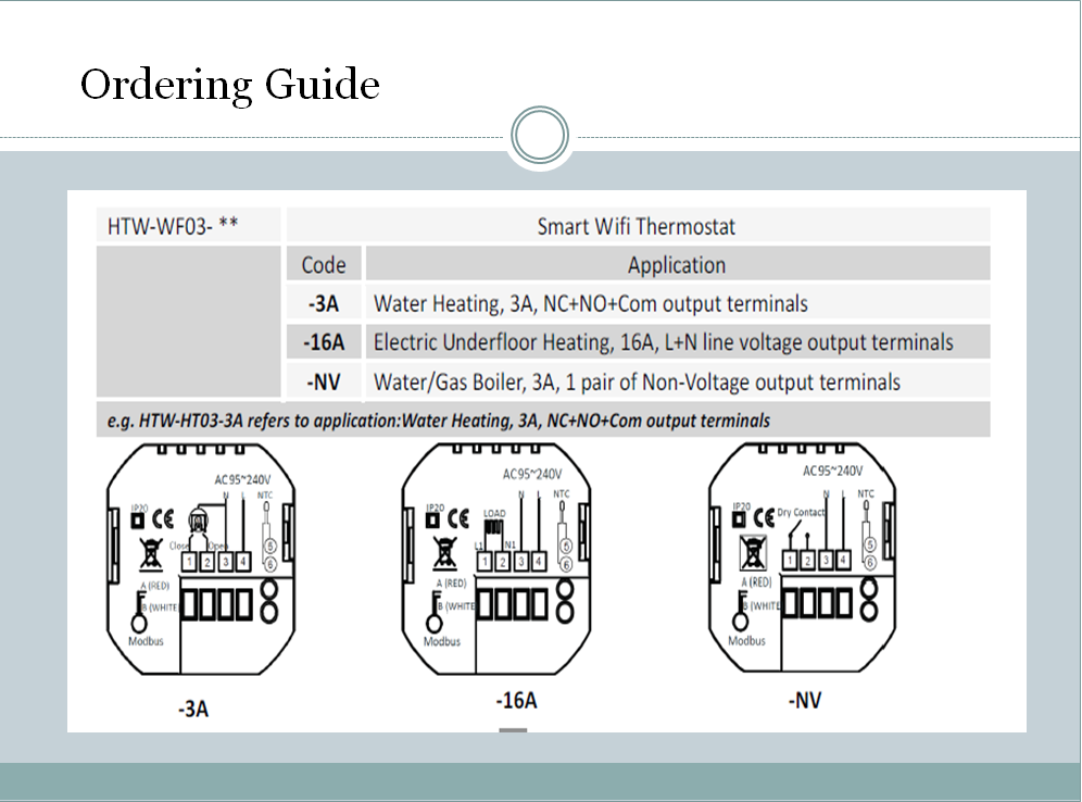 HTW-WF03 series Wifi thermostat is widely used in these environment like Homes, Residential buildings,Schools, Hotels, Hospitals, Offices and etc. to main an ideal room temperature purpose. It can be used inElectric Underfloor Heating, Water Heating or Water/Gas Boiler systems.