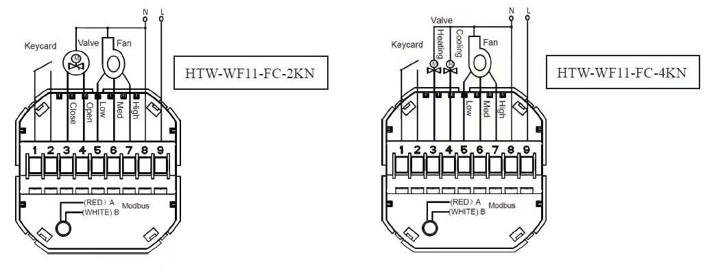 HTW-WF11-FC series Modbus fan coil thermostat is designed to control 4 pipe Fan Coil Unit system, withoutputs of 3 fan speed and 1 cooling valve and 1 heating valve, with remote setback(keycard) input andModbus communication. It is widely used in these environment like Homes, Residential buildings, Schools,Hotels, Hospitals, Offices and etc. to main an ideal room temperature purpose.
