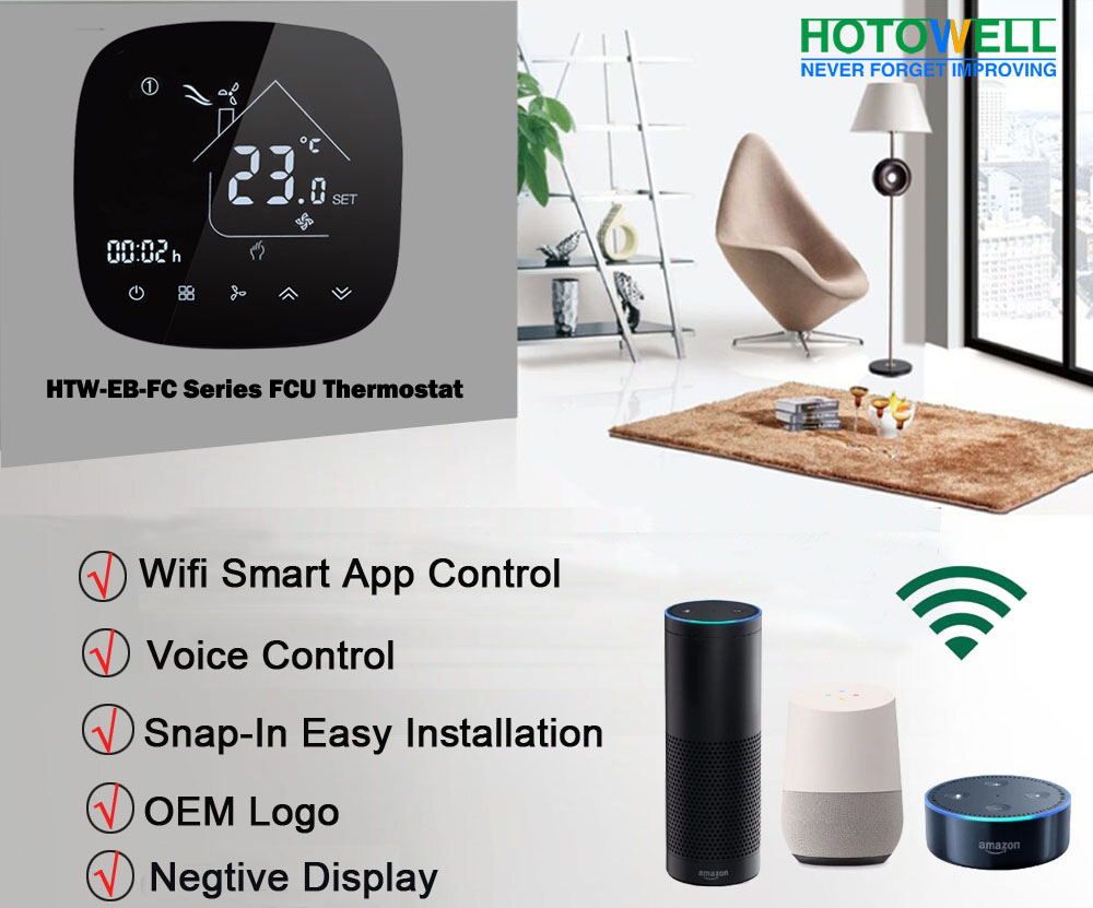 HTW-EB-FC series Smart Wifi fan coil thermostat is widely used in these environment like Homes, Residential buildings, Schools, Hotels, Hospitals, Offices and etc. to main an ideal room temperature purpose.