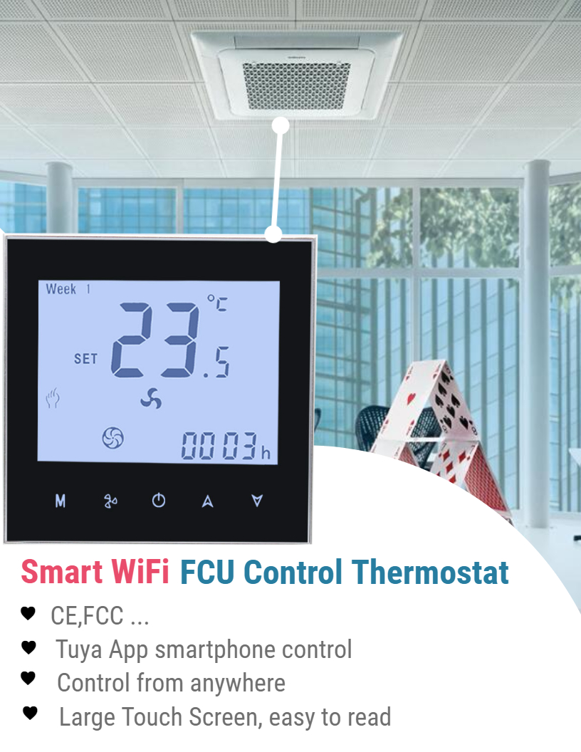 HTW-WF01-FC series Smart Wifi fan coil thermostat. It is widely used in these environment like Homes, Residential building, Schools, Hotels, Hospital, Offices and etc. to main an ideal room temperature purpose.