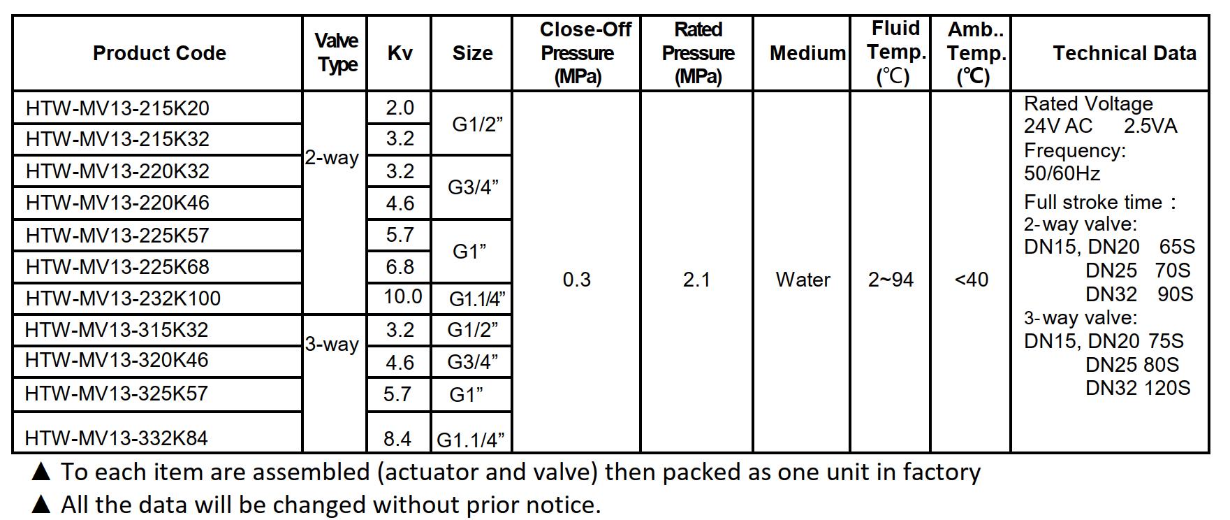 HTW-MV13 series Motorized Modulating Control Valve are mainly used in central air- conditioning cool/heat water system. It can accurately control the flow of cool/heat medium according to the actual requirement, and will not result in sudden change of temperature and to control the room temperature accurately. It provides two types: 2-way and 3-way with sizes: 1/2”, 3/4”, 1” and 1.1/4’optional.