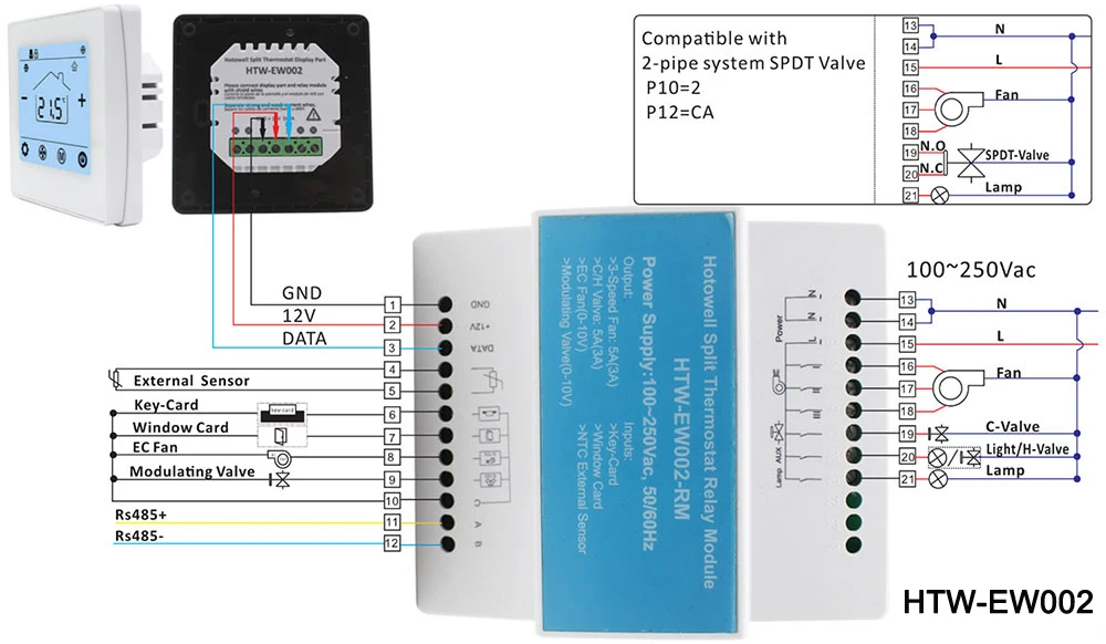 HTW-EW002 is a Noise-Free room climate controller application for water-installation with fan coils/EC fan/Modulating valve. It is designed as a RTU Modbus communicated device to operate the fan coil unit / EC Fan / Modulating Valve of a zone and includes a set of functions for lighting control, zone occupancy and window position based climate control. A high level of comfort and appropriate climate control to ensure maximum energy savings are thus provided.