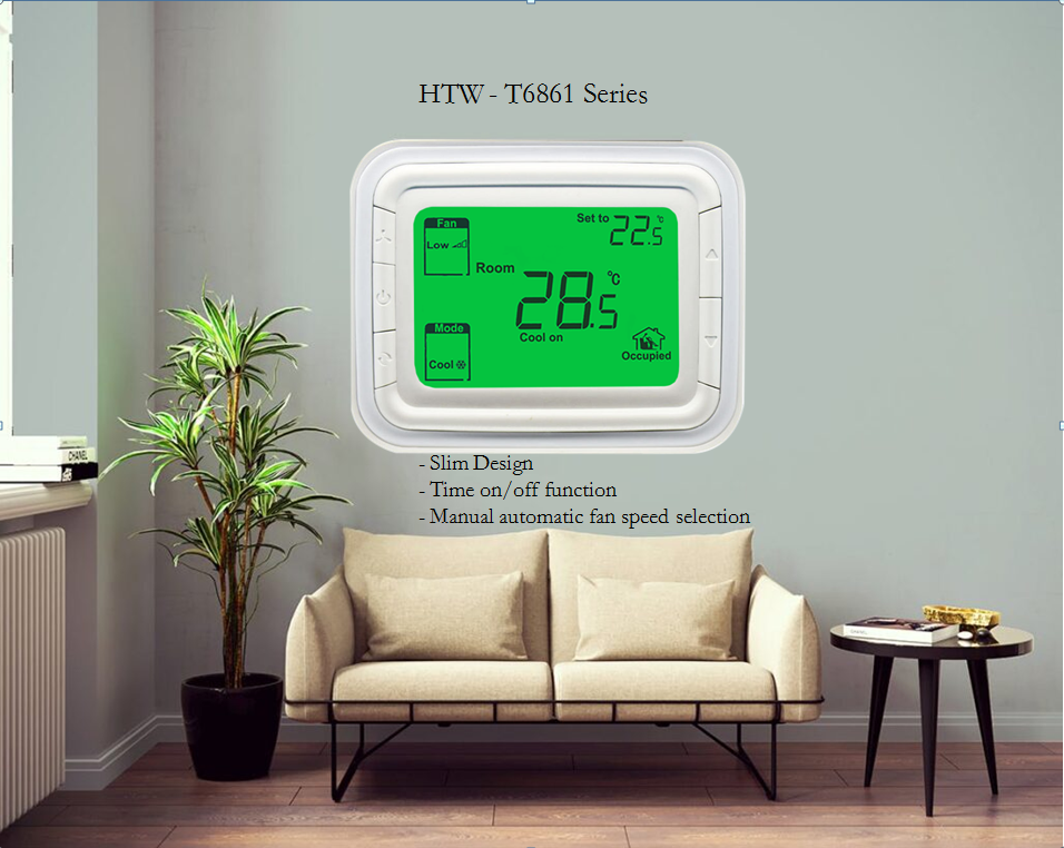 This digital thermostats are designed for application of 3-speed fan and valves in fan coil system. This model with total the same functions with Honeywell raw model T6861.