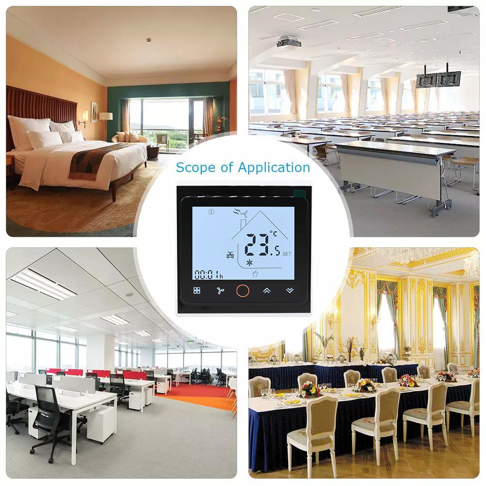 HTW-FT03 series Smart Wifi fan coil thermostat is widely used in these environment like Homes, Residential buildings, Schools, Hotels, Hospitals, Offices and etc. to main an ideal room temperature purpose.
