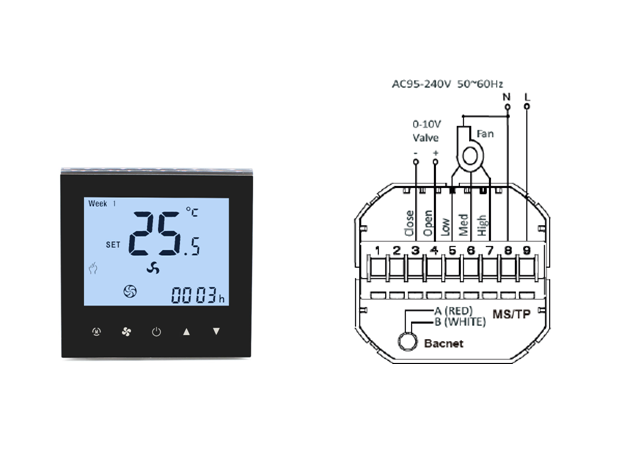 HTW-WF11-FC-KB series BACnet fan coil thermostat is designed to control 4 pipe Fan Coil Unit system, withoutputs of 3 fan speed and 1 cooling valve and 1 heating valve, with remote setback(keycard) input andBACnet communication. It is widely used in these environment like Homes, Residential buildings, Schools,Hotels, Hospitals, Offices and etc. to main an ideal room temperature purpose.