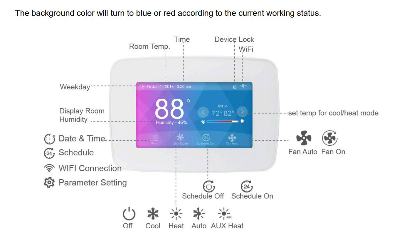 HTW-MT10 Wi-Fi Smart Thermostat is designed to bring comfort to people’s life whether you are at home or on-the-go. The 4.3 inch TFT high-resolution colorful touch screen allows you to adjust the temperature,set the system modes easily.