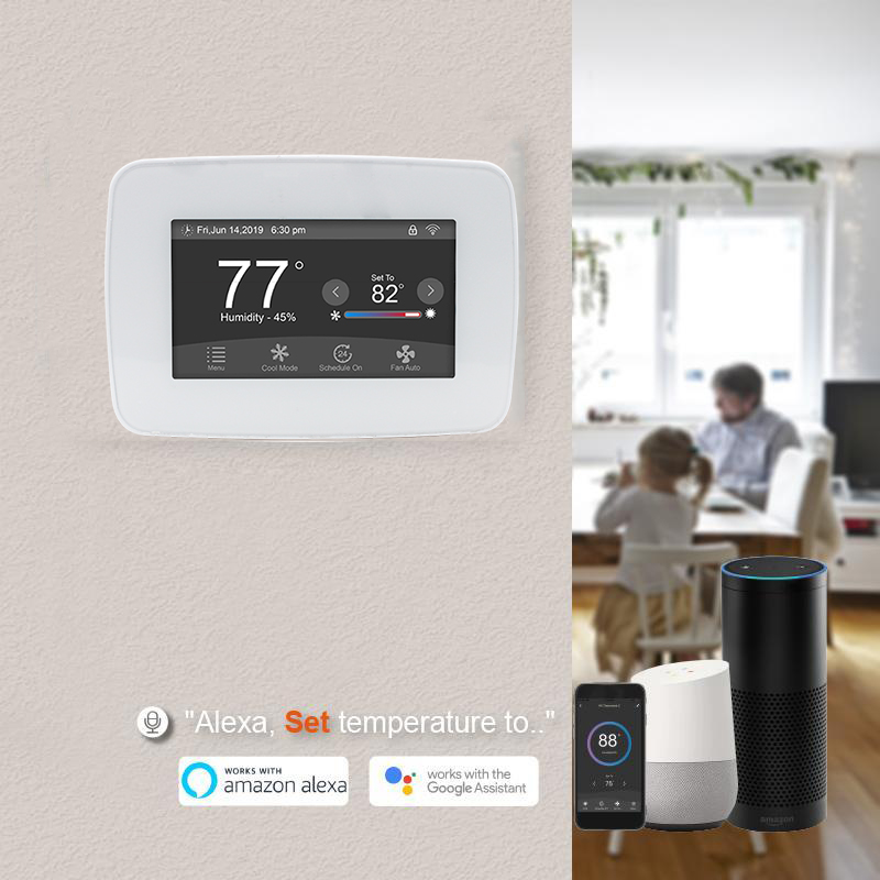 HTW-MT10 Wi-Fi Smart Thermostat is designed to bring comfort to people’s life whether you are at home or on-the-go. The 4.3 inch TFT high-resolution colorful touch screen allows you to adjust the temperature,set the system modes easily. Integrated with Wi-Fi 2.4Ghz, it allows you to have the remotely access,change,or program your room temperatures at anytime, anywhere. You are also able to use smart controls from Google Home/, Amazon Alexa. And Geo-fencing function is available on Application. The smart thermostat has the full compatibility to the systems inclusive of oil fuel/gas fuel/electric fuel/single, two stage ,multi stage heating&cooling.