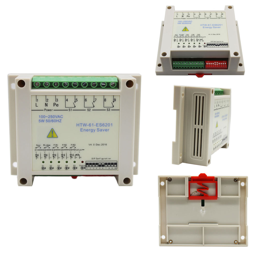 HTW-61-ES6201 has 1 input (E1) for a magnetic room contact placed on the doorframes of the room;1 input (E2) for a magnetic window contact placed on the window frames; 3 inputs(E3,E4,E5) for PIR presence detectors.