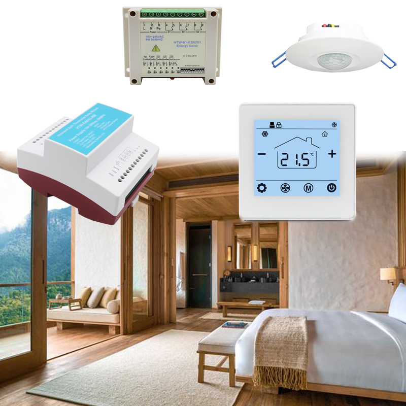 HTW-61-ES6201 is designed to control electrical consumption by detecting occupied/unoccupied presence, in order to connect/disconnect the air conditioning equipment and lighting automatically when the customer accesses or leaves the room.