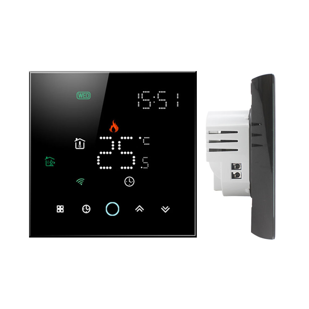This smart thermostat has been developed to be able to switch electric and conventional heating/cooling systems on and off using a set temperature and time remotely at anytime anywhere. It consist of two parts, E-hub & HTW-WKT19-WF. E-hub can be used both as gateway and RF receiver to control heating device as boiler or valve. HTW-WKT13 can be a sender to work with gateway or directly connect to heating device.