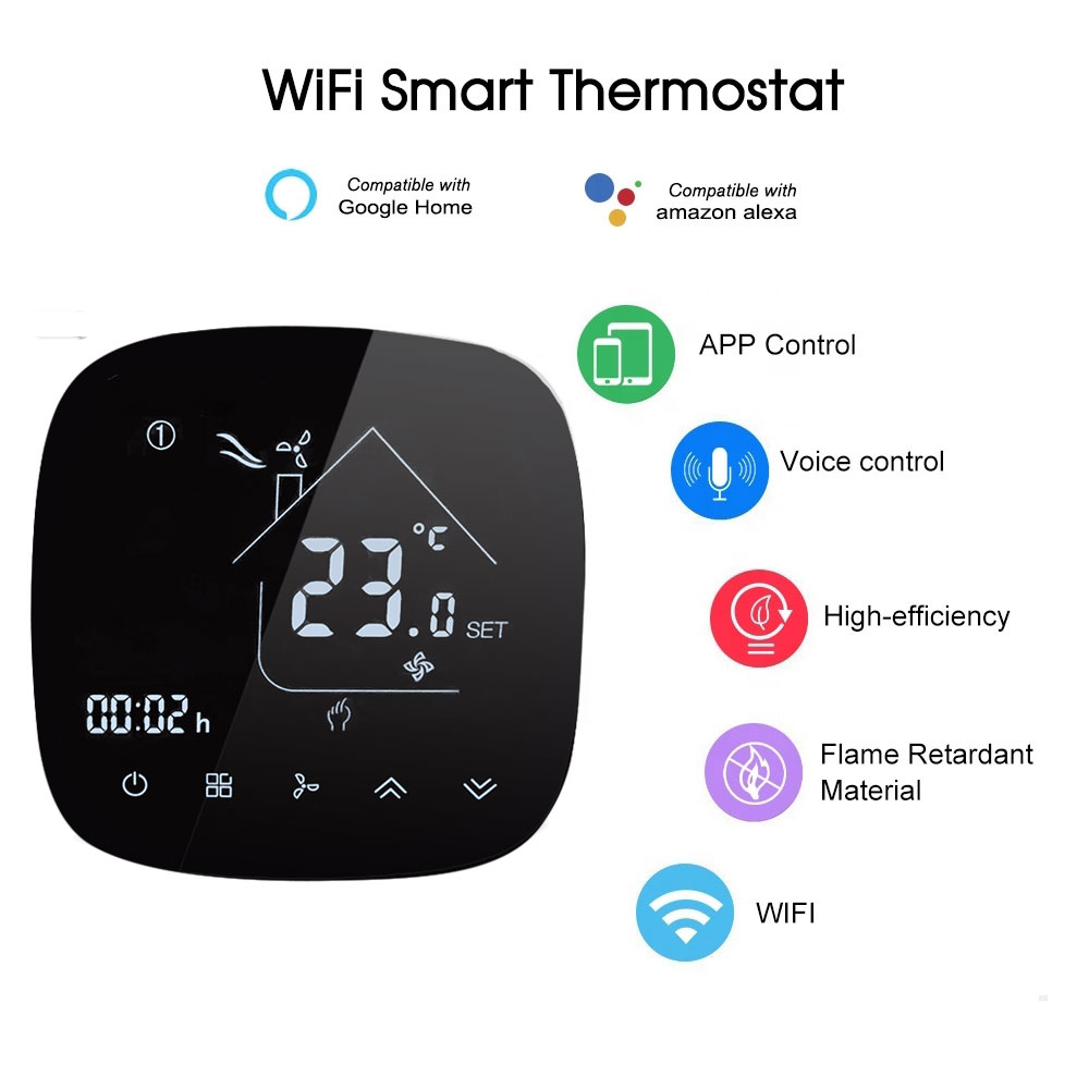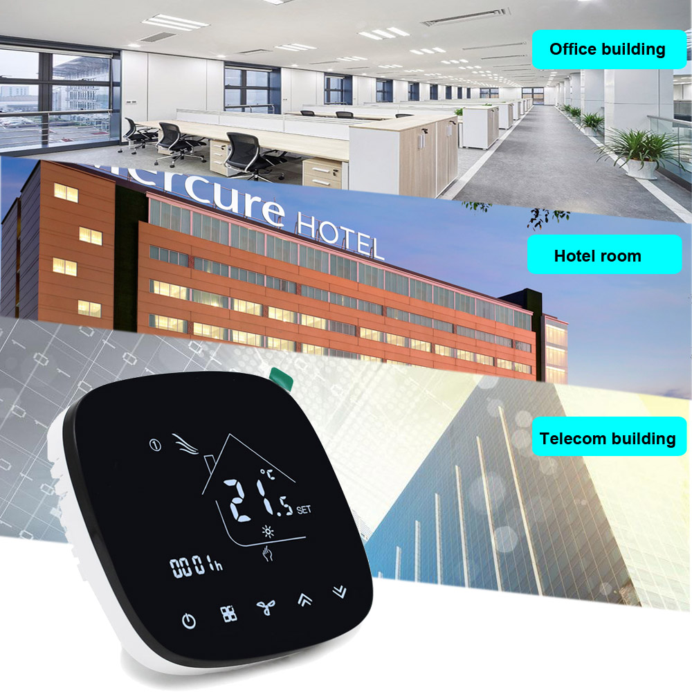 HTW-EB-FC series Smart Wifi fan coil thermostat is widely used in these environment like Homes, Residential buildings, Schools, Hotels, Hospitals, Offices and etc. to main an ideal room temperature purpose.