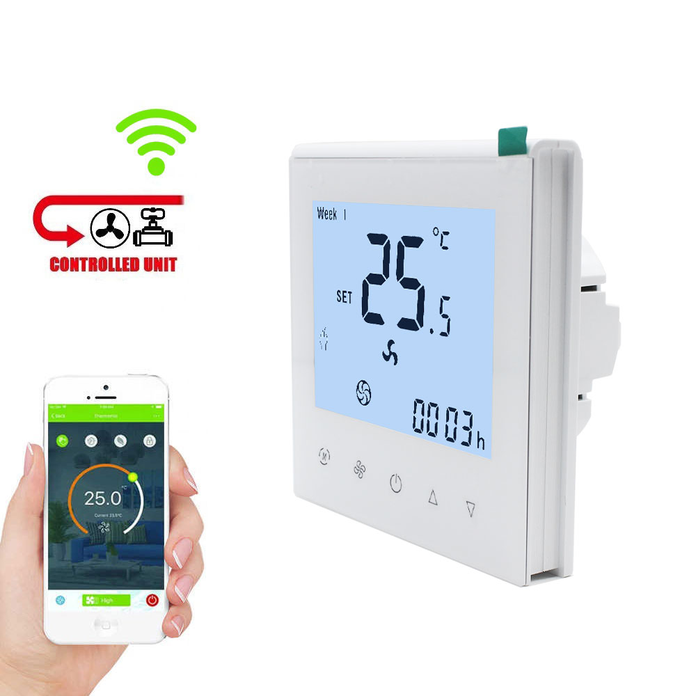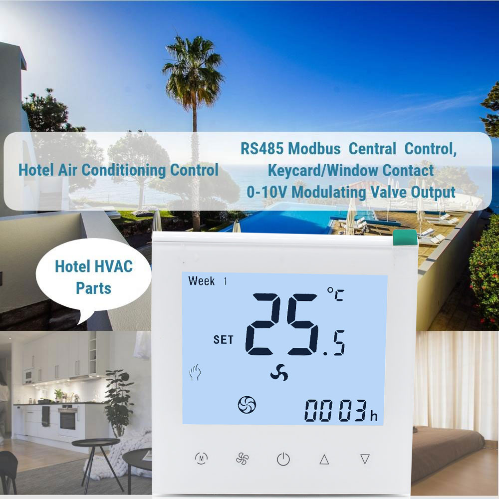 HTW-WF11-FC-MKN series fan coil thermostat is designed to control 2 pipe Fan Coil Unit system, withoutputs of 3 fan speed and 1modulating 0-10V valve, with keycard, with Modbuscommunication. It is widely used in these environments likeHomes, Residential buildings, Schools, Hotels,Hospitals, Offices and etc. to main an ideal room temperature purpose.