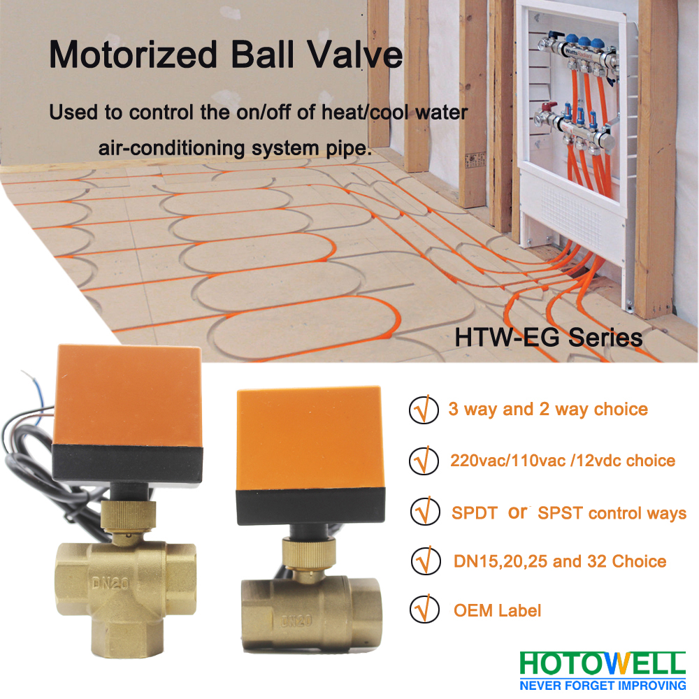 HTW-EG200 Series Motorized Ball Valves are used to control the on/off of heat/cool water air-conditioning system pipe to control the room temperature. The valve is driven by synchronous motor. The motor connects with room thermostats by the terminal of common, open and close. By sampling and dealing with the site data, the thermostats send control signal to open/close the motor of ball valve. Then the heat/cool water enters into fan coil unit to supply the heat or cool air. When the room temperature reaches the set-point, thermostat will send a signal to cut off the ball valve and make it on the best status. Then the room temperature will keep in the comfortable range.