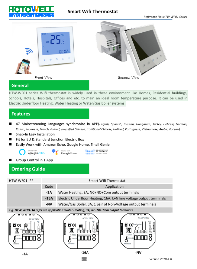 HTW-WF01 series Wifi thermostat is widely used in these environment like Homes, Residential buildings, Schools, Hotels, Hospitals, Offices and etc. to main an ideal room temperature purpose. It can be used in Electric Underfloor Heating, Water Heating or Water/Gas Boiler systems.
