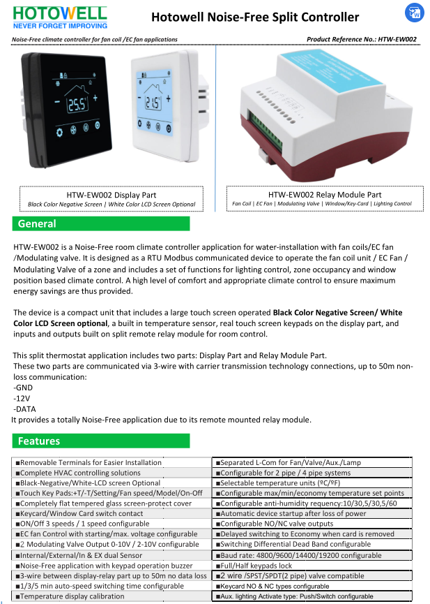 HTW-EW002 is a Noise-Free room climate controller application for water-installation with fan coils/EC fan/Modulating valve. It is designed as a RTU Modbus communicated device to operate the fan coil unit / EC Fan /Modulating Valve of a zone and includes a set of functions for lighting control, zone occupancy and window position based climate control. A high level of comfort and appropriate climate control to ensure maximum energy savings are thus provided.