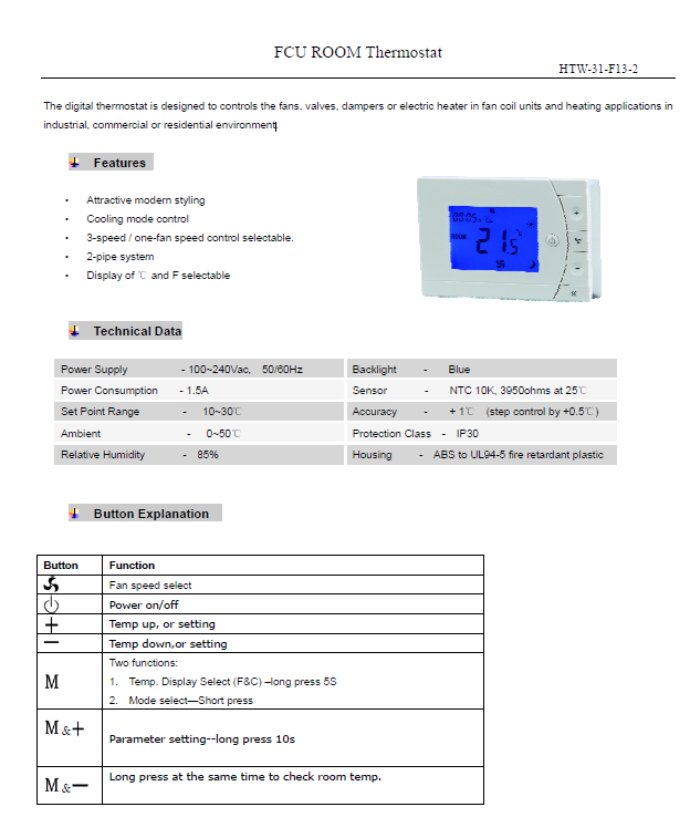 The digital thermostat is designed to controls the fans, valves, dampers or electric heater in fan coil units and heating applications in industrial, commercial or residential environment