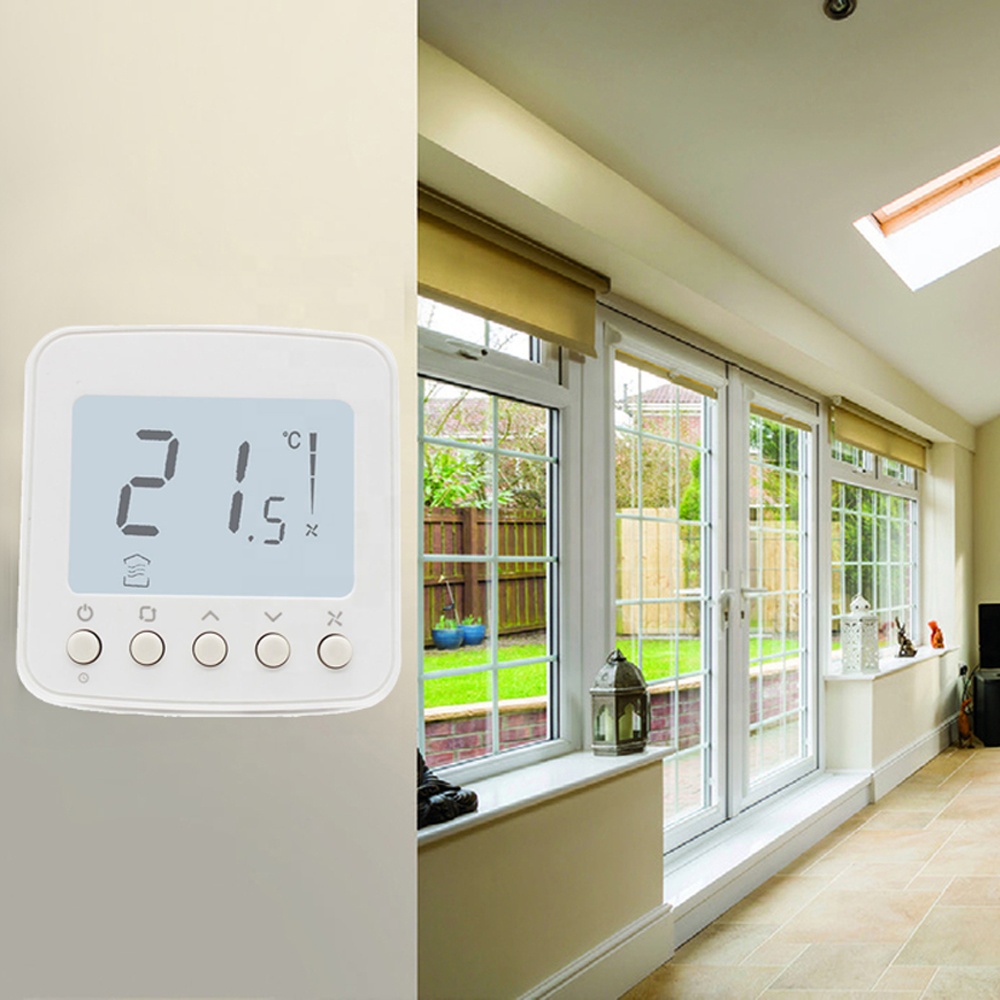 The TF228WN digital thermostat with 220vac line voltage, 3-speed fan, 2 pipe system and on/off valve control in fan coil system.