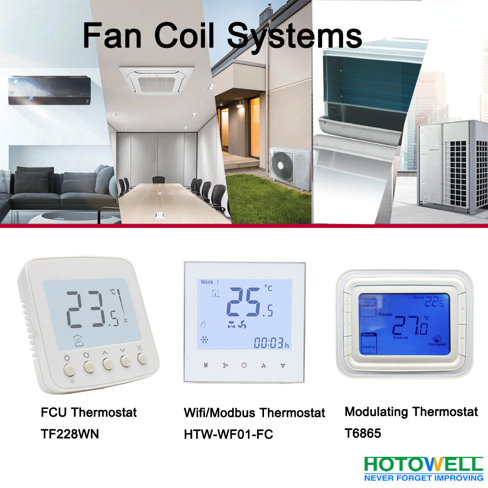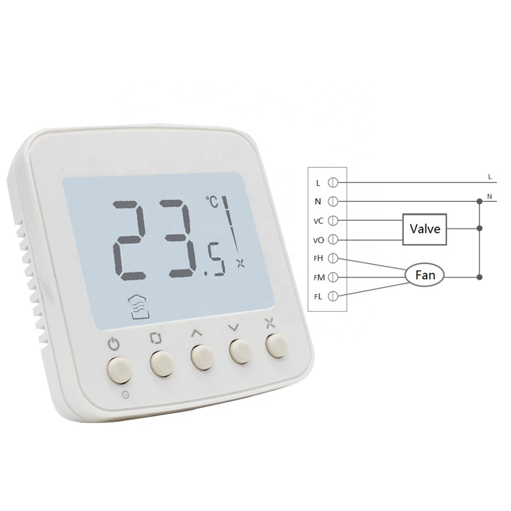 The TF228WN digital thermostat with 220vac line voltage, 3-speed fan, 2 pipe system and on/off valve control in fan coil system.