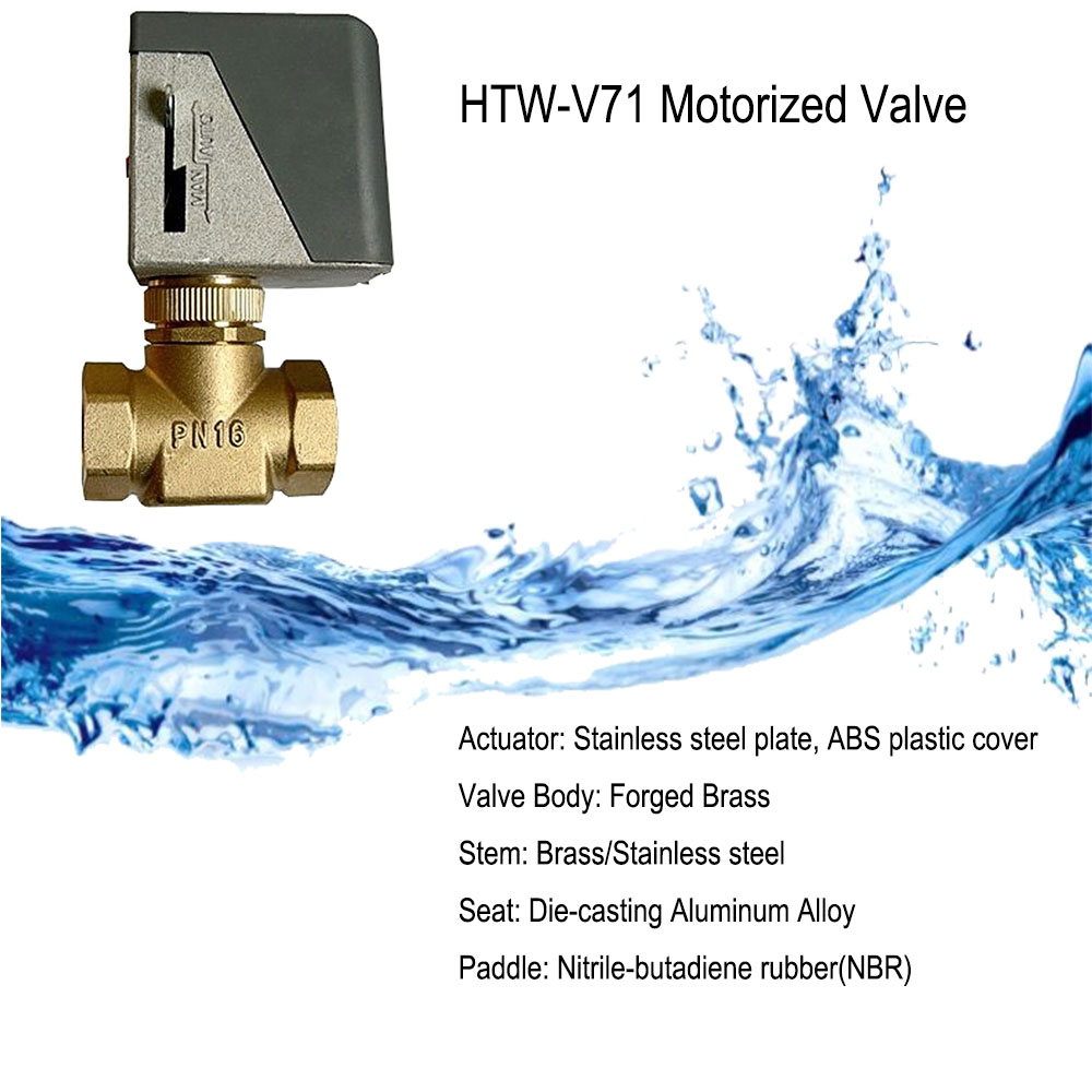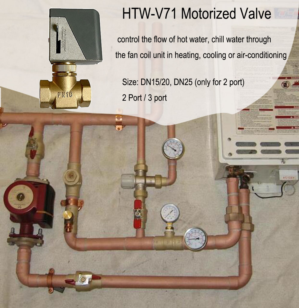 HTW-V71 Series Motorized Valves are used to control the flow of hot water, chill water through the fan coil unit in heating, cooling or air-conditioning applications, so as to control room temperature indirectly. When thermostat sends the controlling signal to the motorized valve, the valve is opened with water flowing, and when the signal disappears, the valve, with the help of its own spring, returns back to its original place to close the valve so as to stop the water flow