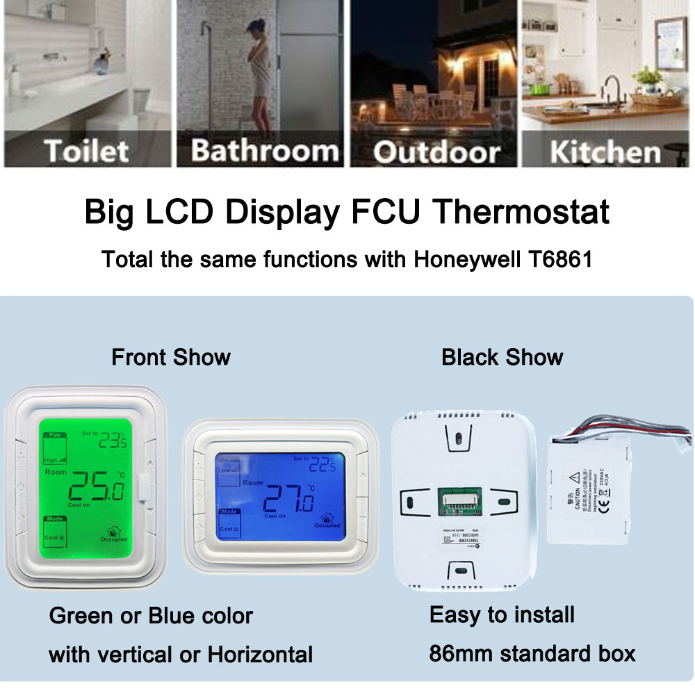 These digital thermostats are designed for the application of 3-speed fan and valves in fan coil system. This model with total the same functions as Honeywell raw model T6861.