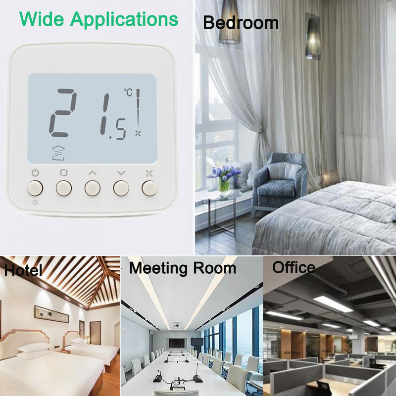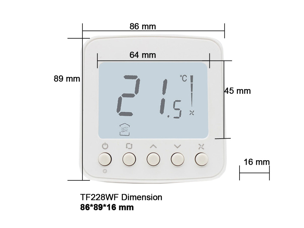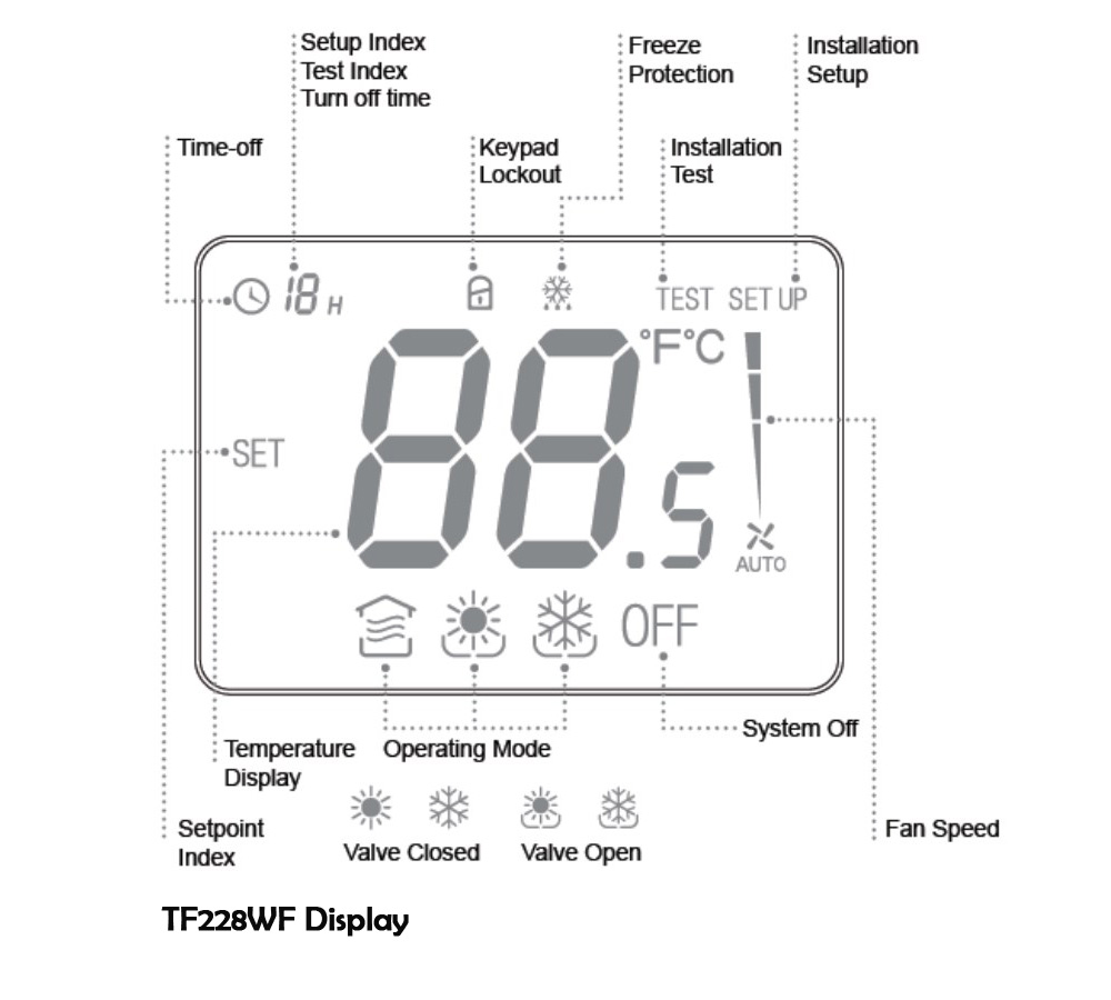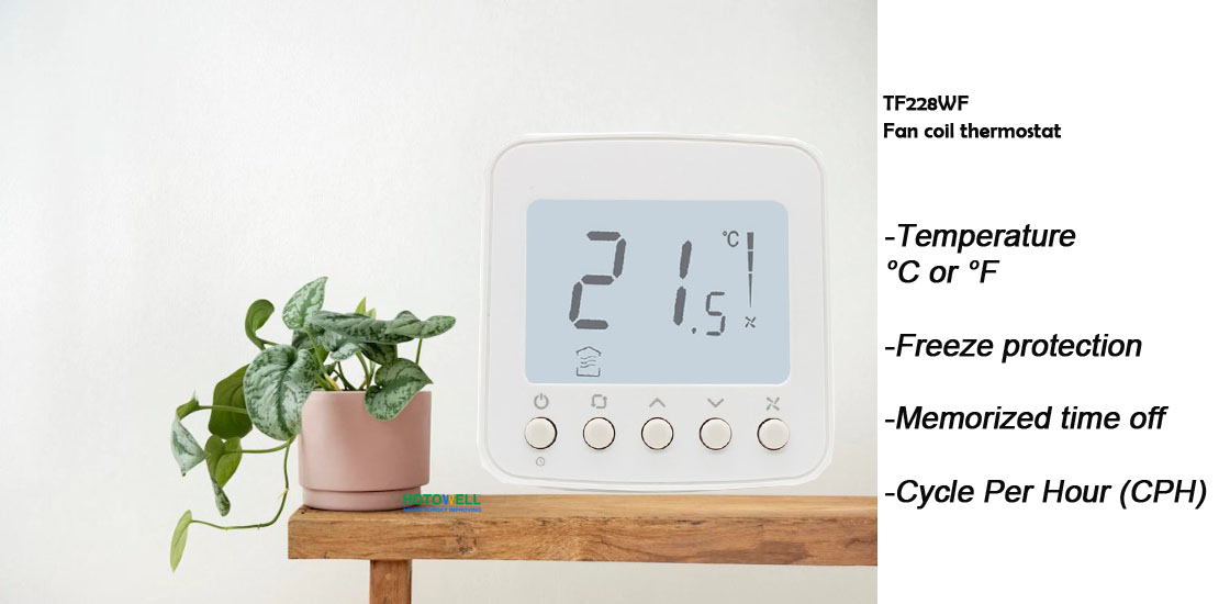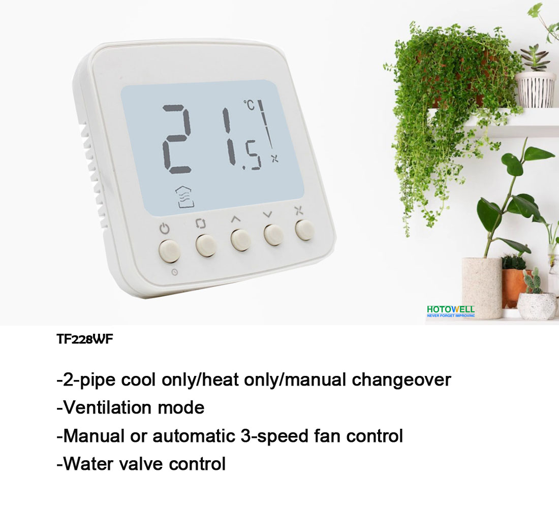 The TF228WN digital thermostat is designed for 3-speed fan and valve control in a fan coil system.