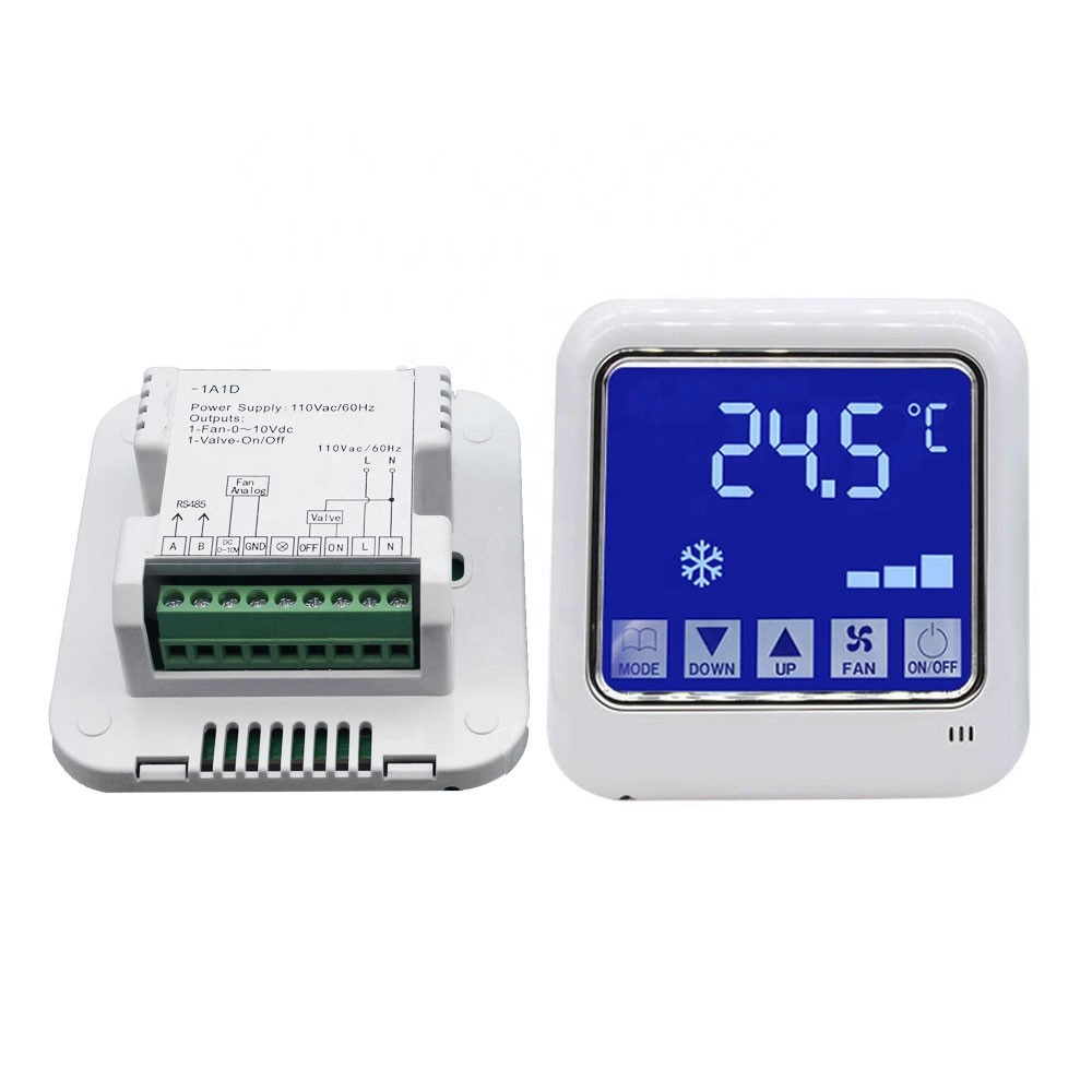 The device includes a built in temperature sensor on its front panel for room temperature measurement, and features an advanced control algorithm for fan coil speed and valve position control.