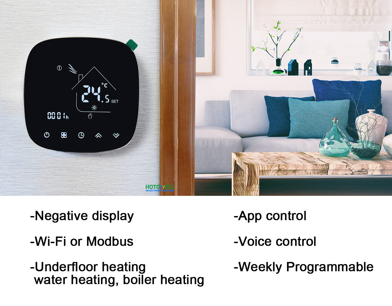 HTW-ECB6 series Wifi thermostat is widely used in these environment like Homes, Residential buildings, Schools, Hotels, Hospitals, Offices and etc. to main an ideal room temperature purpose. It can be used in Electric Underfloor Heating, Water Heating or Water/Gas Boiler systems.