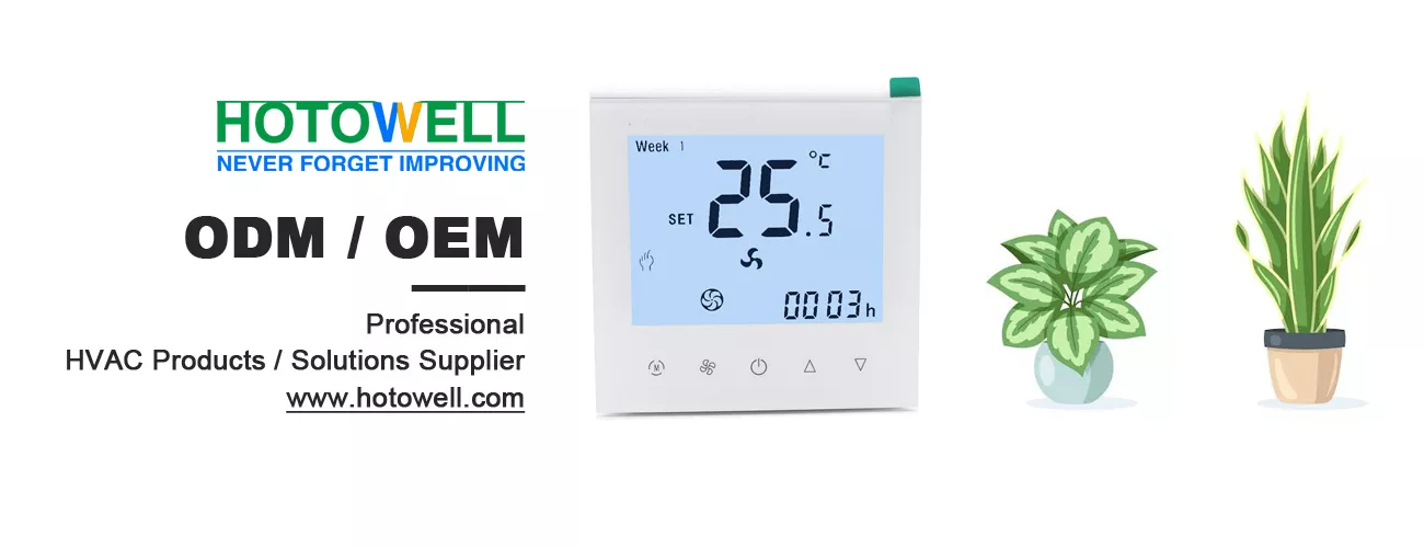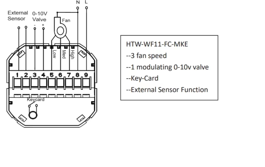 HTW-WF11-FC-MKE series fan coil thermostat is designed to control 2 pipe Fan Coil Unit system, with outputs of 3 fan speed and 1 modulating 0-10V valve, with remote setback (keycard) input or external sensor input. It is widely used in these environments like Homes, Residential buildings, Schools, Hotels, Hospitals, Offices and etc to main an ideal room temperature purpose..