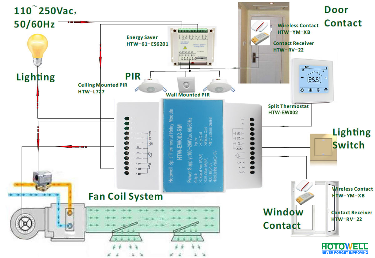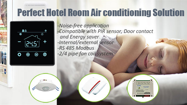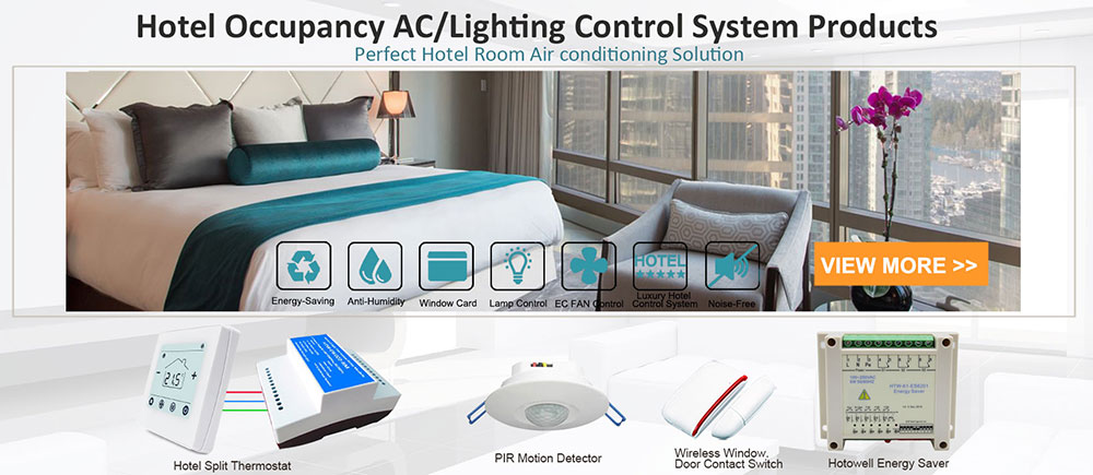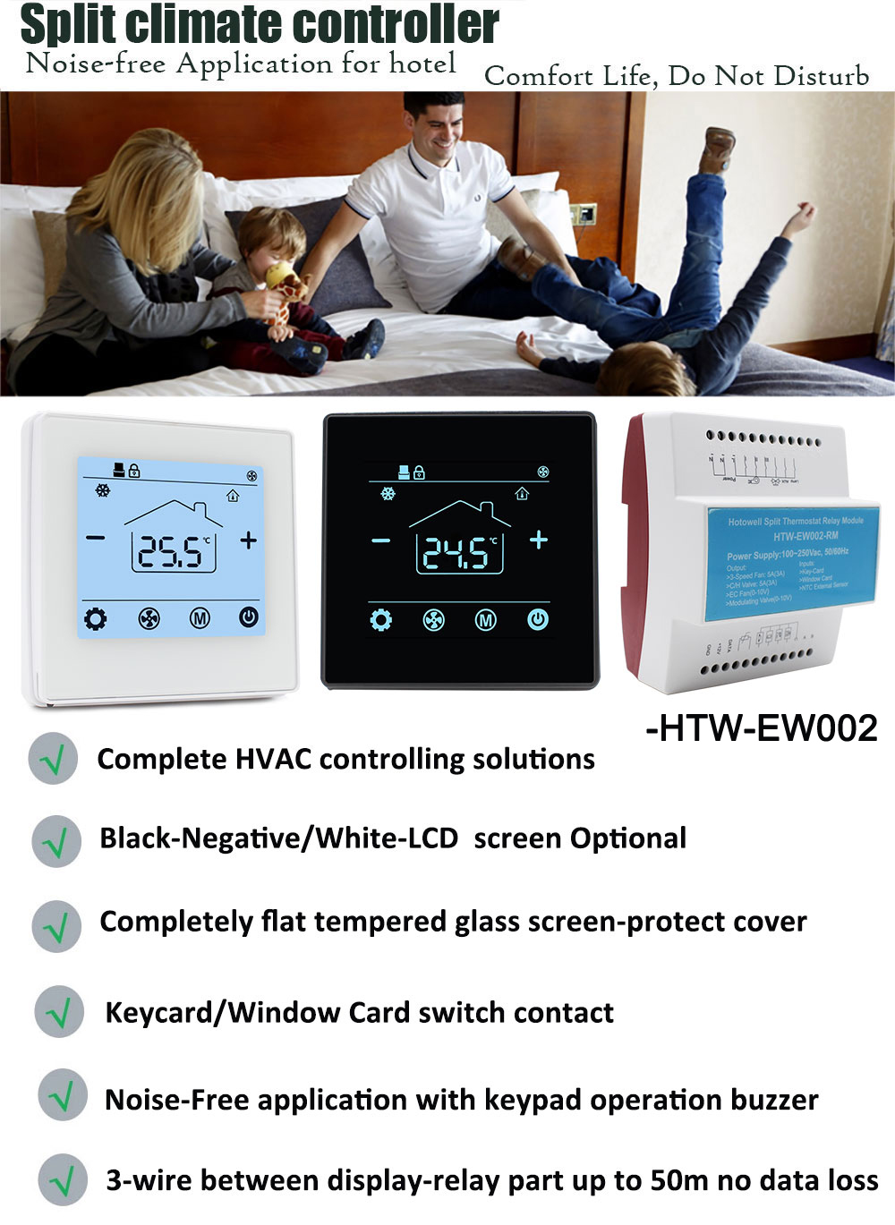 * AC controlling solutions * Configurable for 2 pipe / 4 pipe systems * Black-Negative/White-LCD screen Optional * Selectable temperature units (ºC/ºF) * Touch Key Pads:+T/-T/Setting/Fan speed/Model/On-Off * Configurable max/min/economy temperature set points * Completely flat tempered glass screen-protect cover * Configurable anti-humidity requency:10/30,5/30,5/60 * Keycard/Window Card switch contact * Automatic device startup after loss of power * ON/Off 3 speeds / 1 speed configurable * Configurable NO/NC valve outputs * EC fan Control with starting/max. voltage configurable * Delayed switching to Economy when card is removed * Modulating Valve Output 0-10V / 2-10V configurable * Switching Differential Dead Band configurable * Internal/External/In & EX dual Sensor * Baud rate: 4800/9600/14400/19200 configurable * Noise-Free application with keypad operation buzzer * Full/Half keypads lock * 3-wire between display-relay part up to 50m no data loss * 2 wire /SPST/SPDT(2 pipe) valve compatible * 1/3/5 min auto-speed switching time configurable * Keycard NO & NC types configurable * Temperature display calibration * Aux. lighting Activate type: Push/Switch configurab