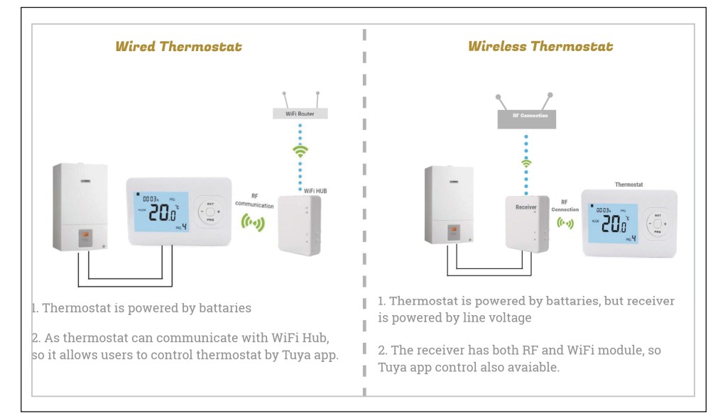 This smart thermostat has been developed to be able to switch electric and conventional heating/cooling systems on and off using a set temperature and time remotely at anytime anywhere. It consist of two parts, E-hub & HTW-WKT13 . E-hub can be used both as gateway and RF receiver to control heating device as boiler or valve. HTW-WKT13 can be a sender to work with gateway or directly connect to heating device.
