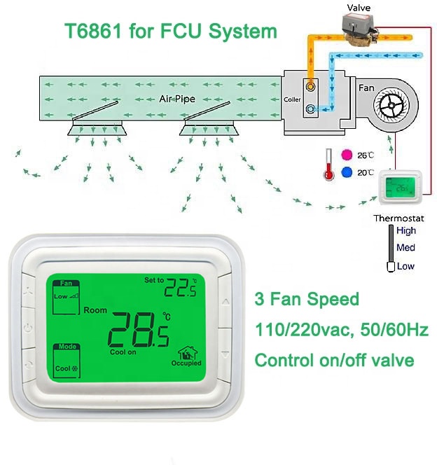 This digital thermostats are designed for application of 3-speed fan and valves in fan coil system. This model with total the same functions with Honeywell raw model T6861.
