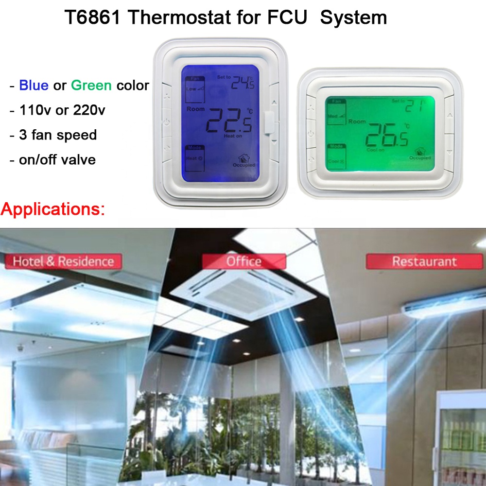 his digital thermostats are designed for application of 3-speed fan and valves in fan coil system. This model with total the same functions with Honeywell raw model T6861.Include T6861H1WB, T6861H1WG, T6861H2WB, T6861H2WG, T6861V1WB, T6861V1WG, T6861V2WB, and T6861V2WG eight types Choice, could meet different requirements accordingly.