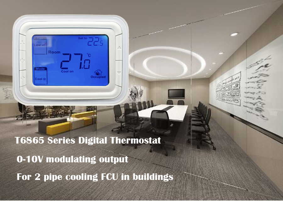 T6865 digital thermostats are designed for application of 3-speed fan and modulating valves in fan coil system. This model include Blue or Green color choice with Horizontal shape. With power 24vac 50/60Hz for modulating valve.Our this model with the same functions with Honeywell T6865, include choice of Remote sensor or Remote set-back.