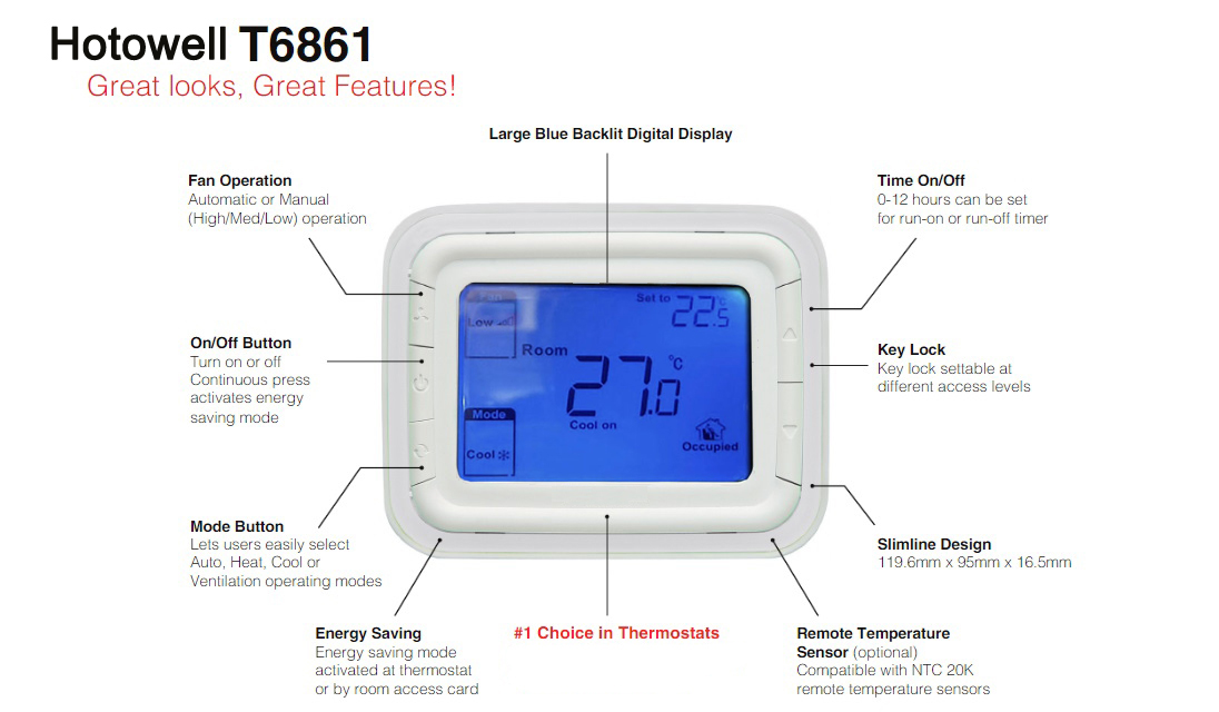 This digital thermostats are designed for application of 3-speed fan and valves in fan coil system.