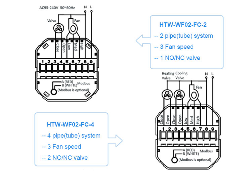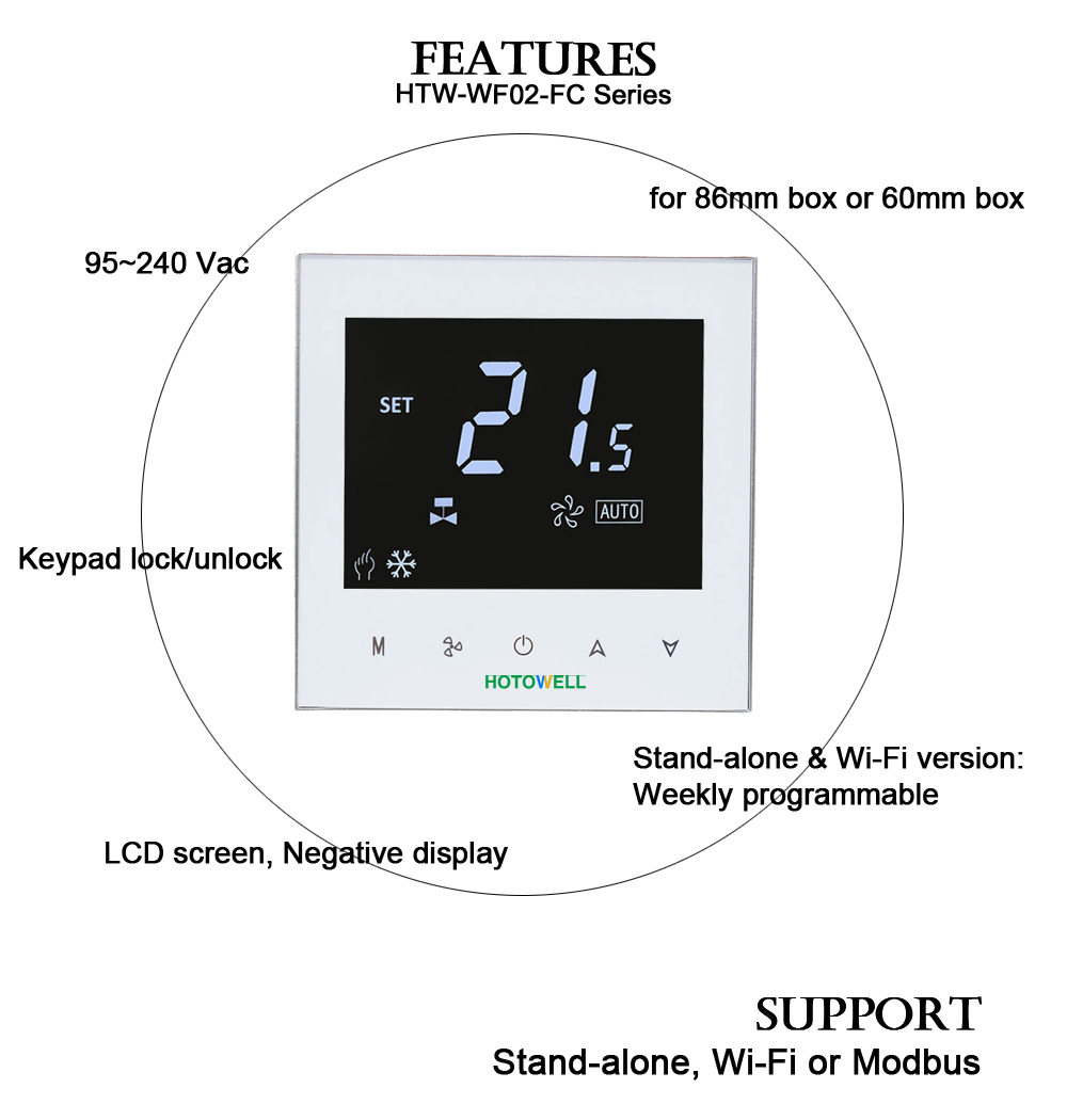 HTW-WF02-FC series Smart Wifi fan coil thermostat. It is widely used in these environment like Homes, Residential building, Schools, Hotels, Hospital, Offices and etc. to main an ideal room temperature purpose.