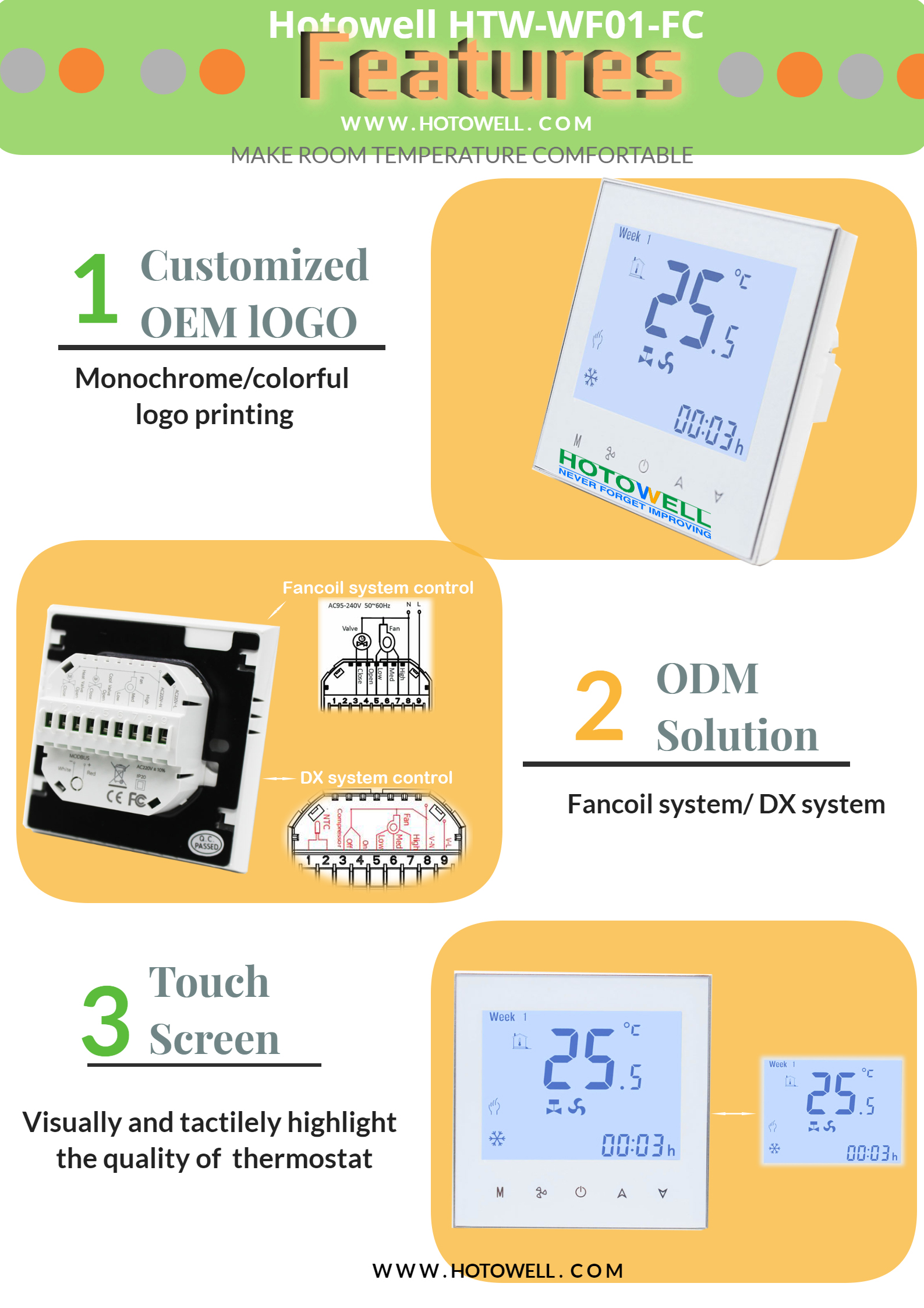 HTW-WF01-FC series fan coil thermostat is widely used in these environments like Homes, Residential buildings, Schools, Hotels, Hospitals, Offices and etc. to maintain an ideal room temperature purpose.