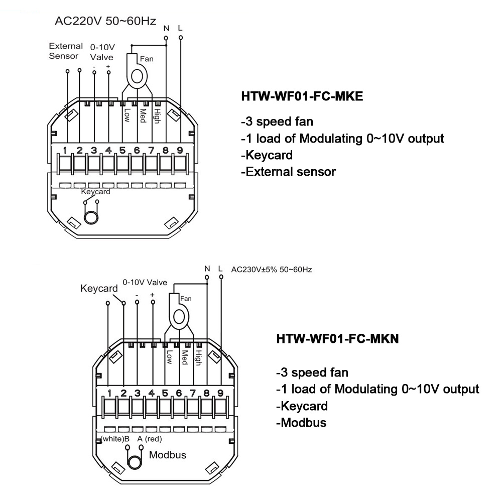 e.g. HTW-WF01-FC-2KP refers to application: 2 pipe(tube) system, 3 fan speed + 1 H/C valve, with key card and weekly programmable