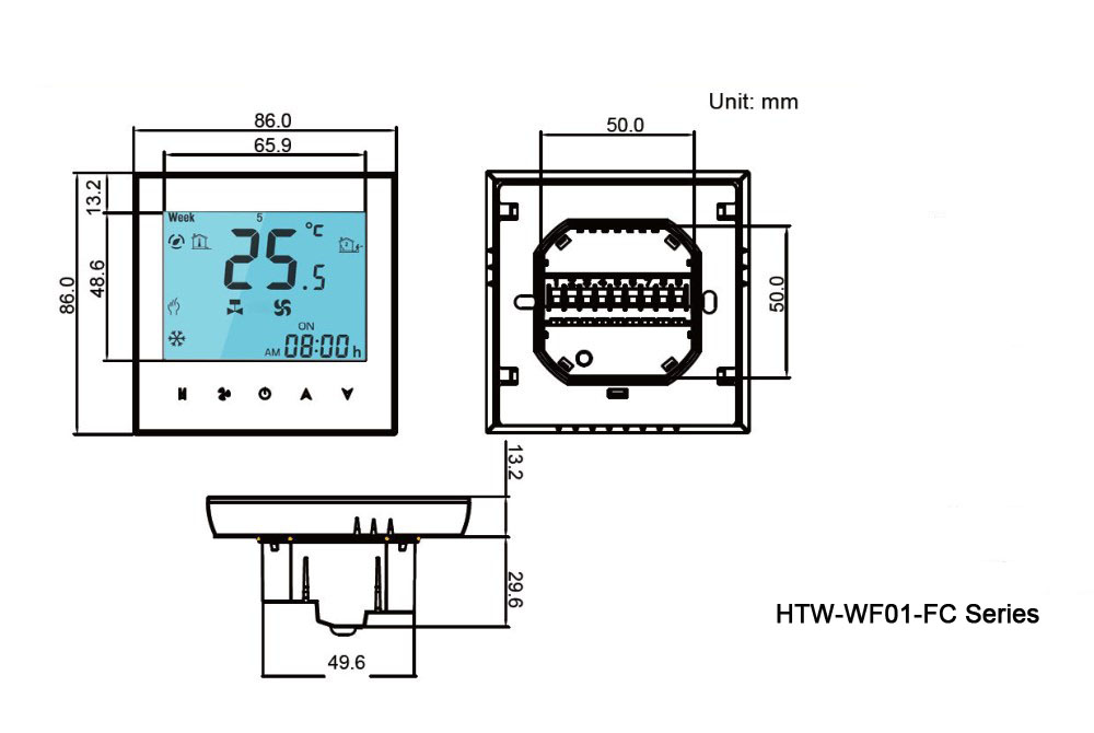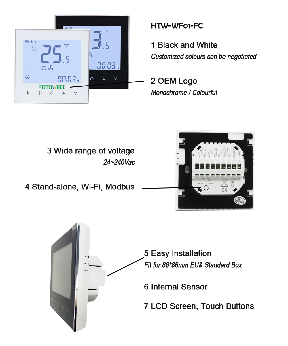 HTW-WF01-FC series fan coil thermostat is widely used in these environments like Homes, Residential buildings, Schools, Hotels, Hospitals, Offices and etc. to maintain an ideal room temperature purpose.