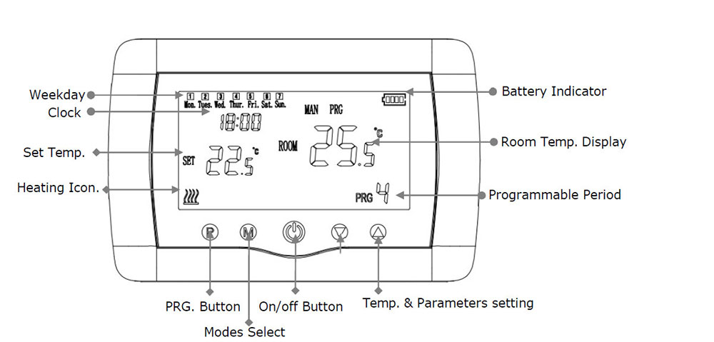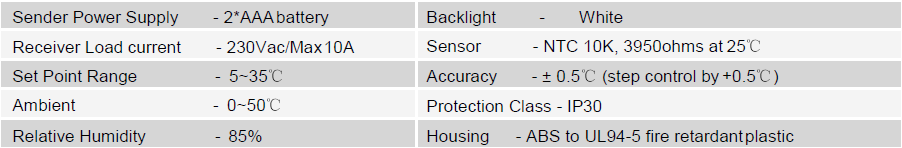 * Large display can be clearly read with the background lighting. * 4 periods of each day programmable * The display shows the set temperature as well as the measured temperature, time. * Temperature display in degrees Celsius. * The thermostat is supplied with a wall-fixing frame, base and a very compact receiver (surface-mounted).